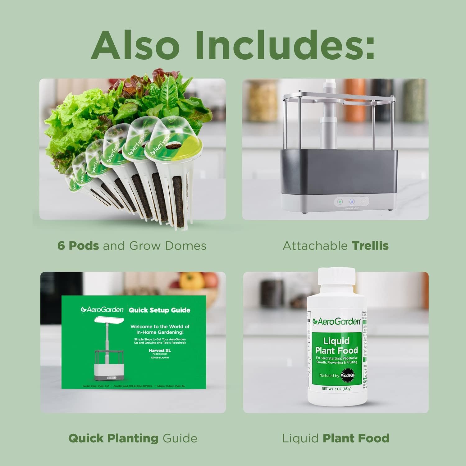 Qué incluye: el AeroGarden Harvest XL viene con un sistema de luz LED de crecimiento de 25 W, enrejado, adaptador de corriente, uno de 3 onzas. Botella de alimento vegetal líquido y el kit de cápsulas de semillas de hierbas gourmet con albahaca genovesa, perejil rizado, eneldo, tomillo, albahaca tailandesa y menta
