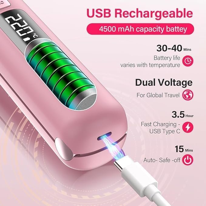 Batería grande y largo tiempo de uso: equipado con una batería recargable de alta capacidad de 4500 mAh, este alisador de pelo se puede cargar fácilmente con una carga USB-C. Una sola carga proporciona hasta 30-40 minutos de tiempo de uso.