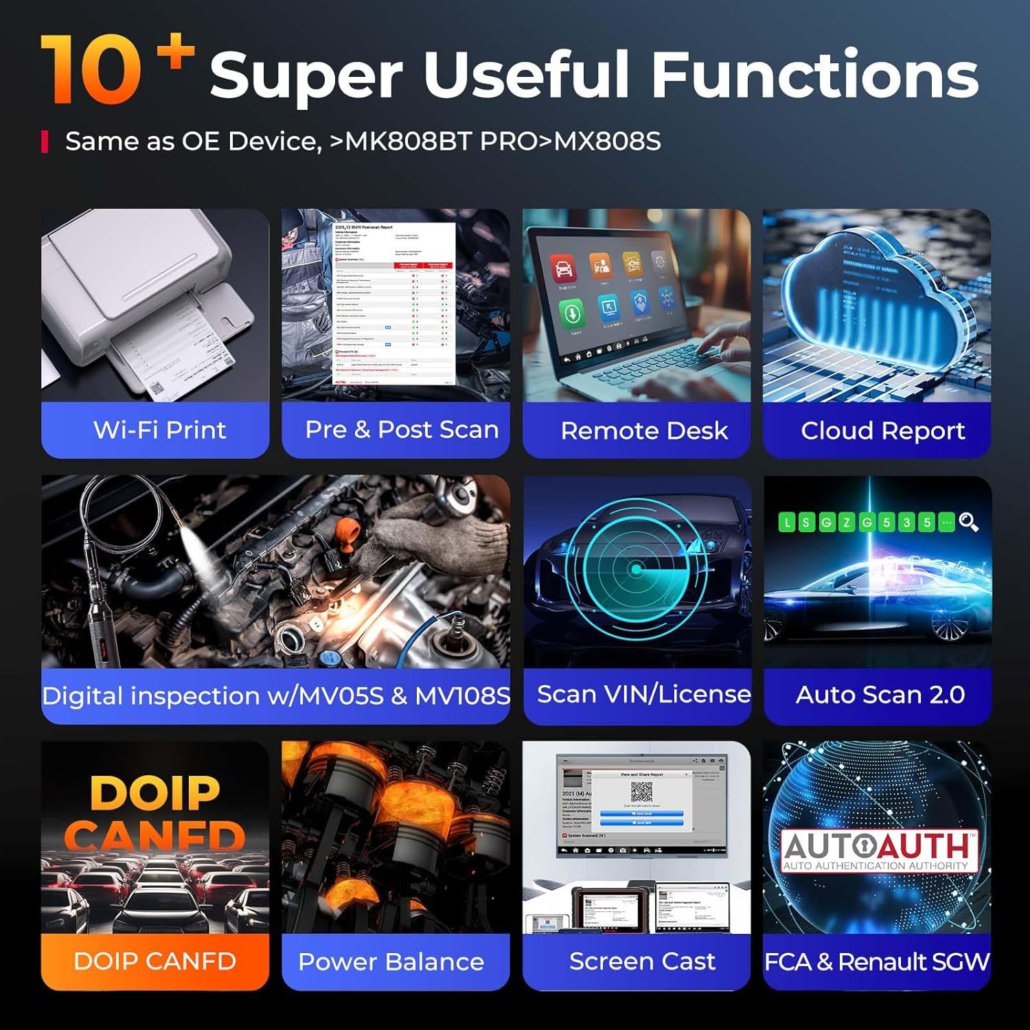 🔥【Cobertura de más de 150 marcas > MK808BT Pro, más de 10 funciones de gama alta】 Autel MaxiCOM MK900 es todo lo que necesitas para diagnosticar el 99% de los automóviles EE.UU./UE/Asia. Es compatible con CAN-FD y DOIP sin adaptadores adicionales; puede obtener acceso de diagnóstico a 2018+ FCA SGW a través de AutoAuth registrada y 2015+ Renault SGW actualización a V4.50+; funcionando = herramientas de escaneo elegantes que valoran en más de 1500 dólares. Más de 10 funciones de gama alta: Informe de escaneo previo y posterior + escritorio remoto los profesionales te ayudan a resolver problemas de forma remota + impresión Wi-Fi + AutoVIN 2.0 + con MV105S/108S.