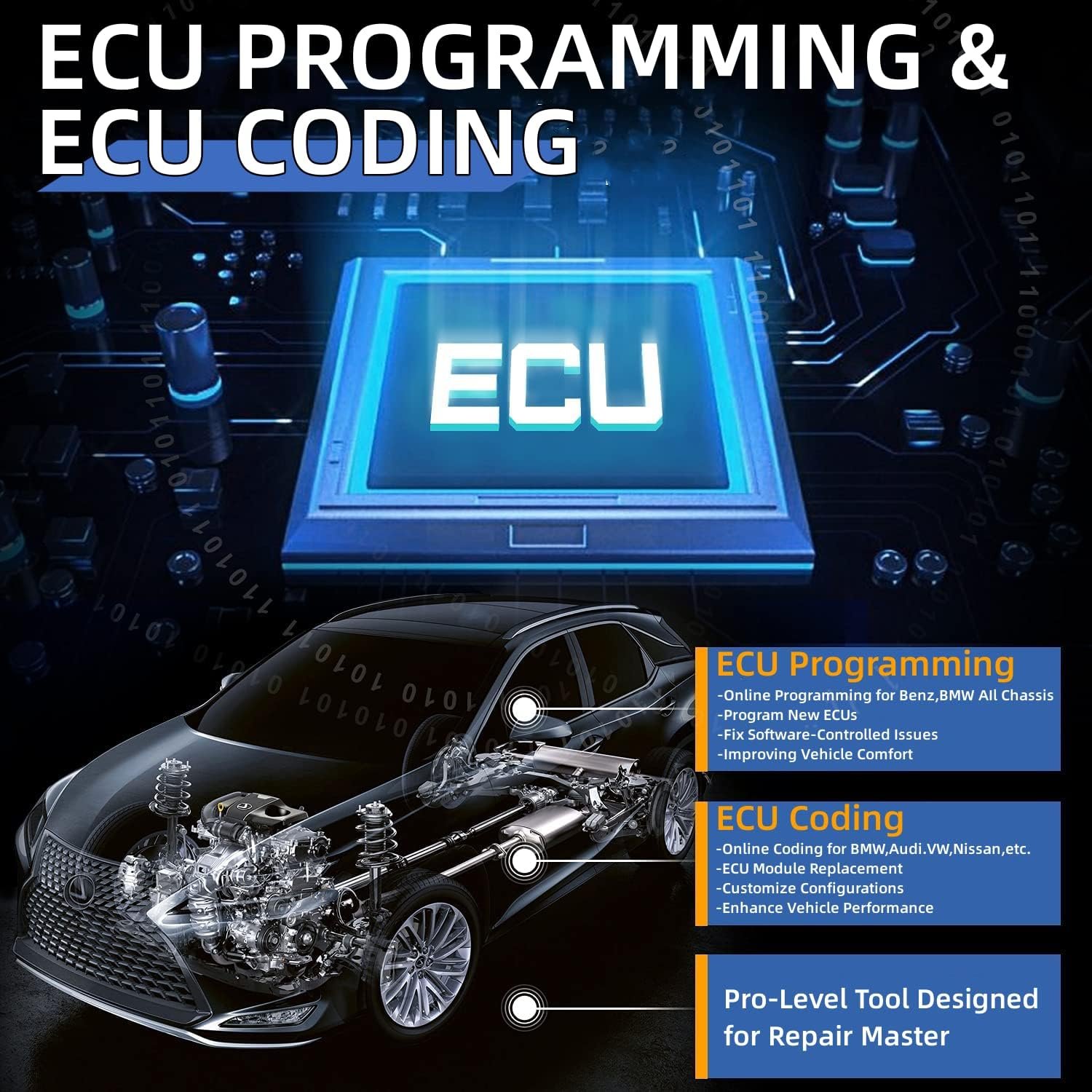 Programación y codificación de ECU: el escáner MaxiSys Ultra soporta programación ECU para BMW, Mercedes Benz para actualizar el software/firmware de ECU, programar nuevos módulos y solucionar problemas controlados por software y manejabilidad. Además de la programación ECU, Autel MaxiSys Ultra también admite codificación ECU avanzada en muchos autos normales, que pueden desplegar las características ocultas. y activar funciones de gama alta para mejorar el rendimiento del vehículo. Nota: La programación y codificación de ECU no es universal, puede enviar a la verificación de la tarjeta de crédito autelac@outlook.com.