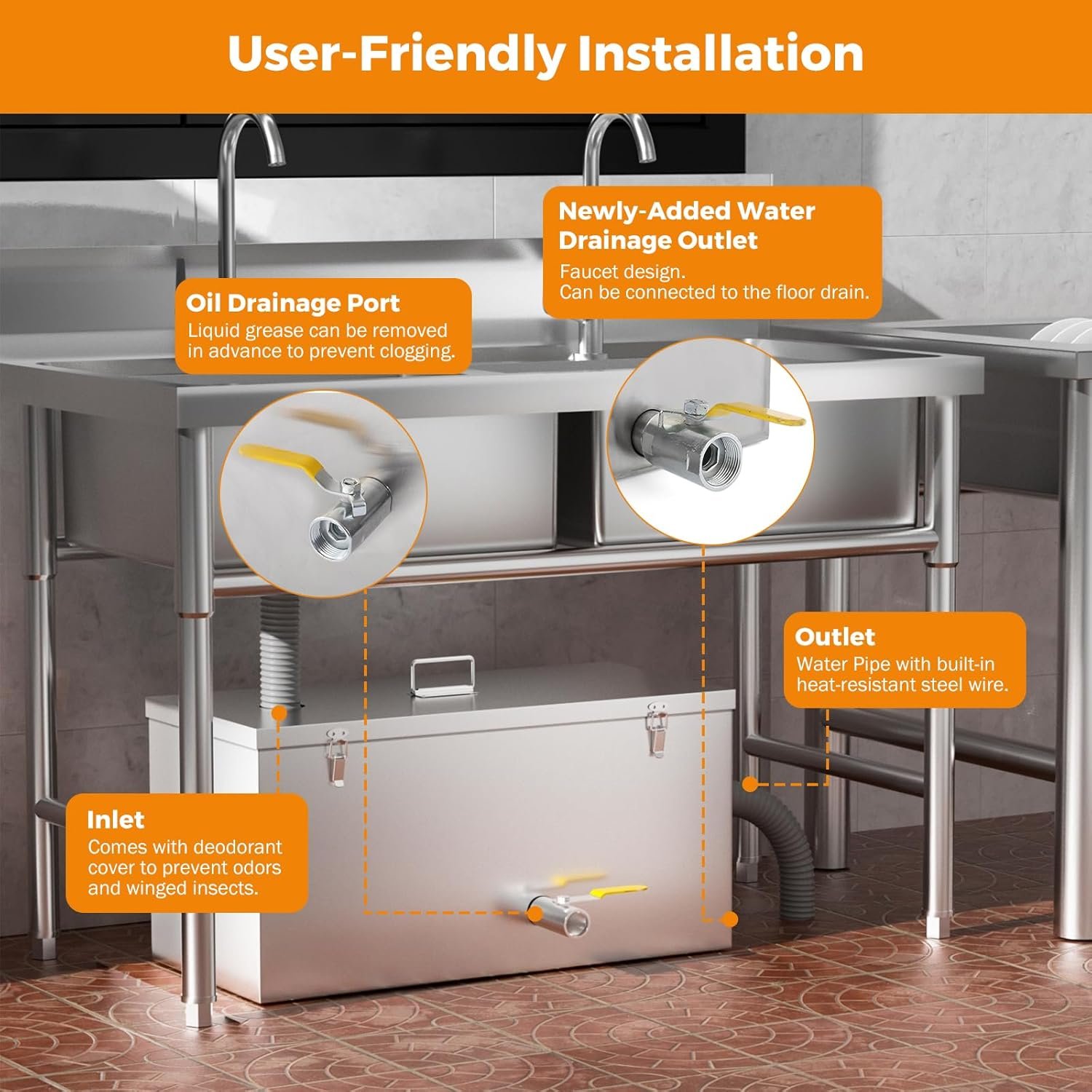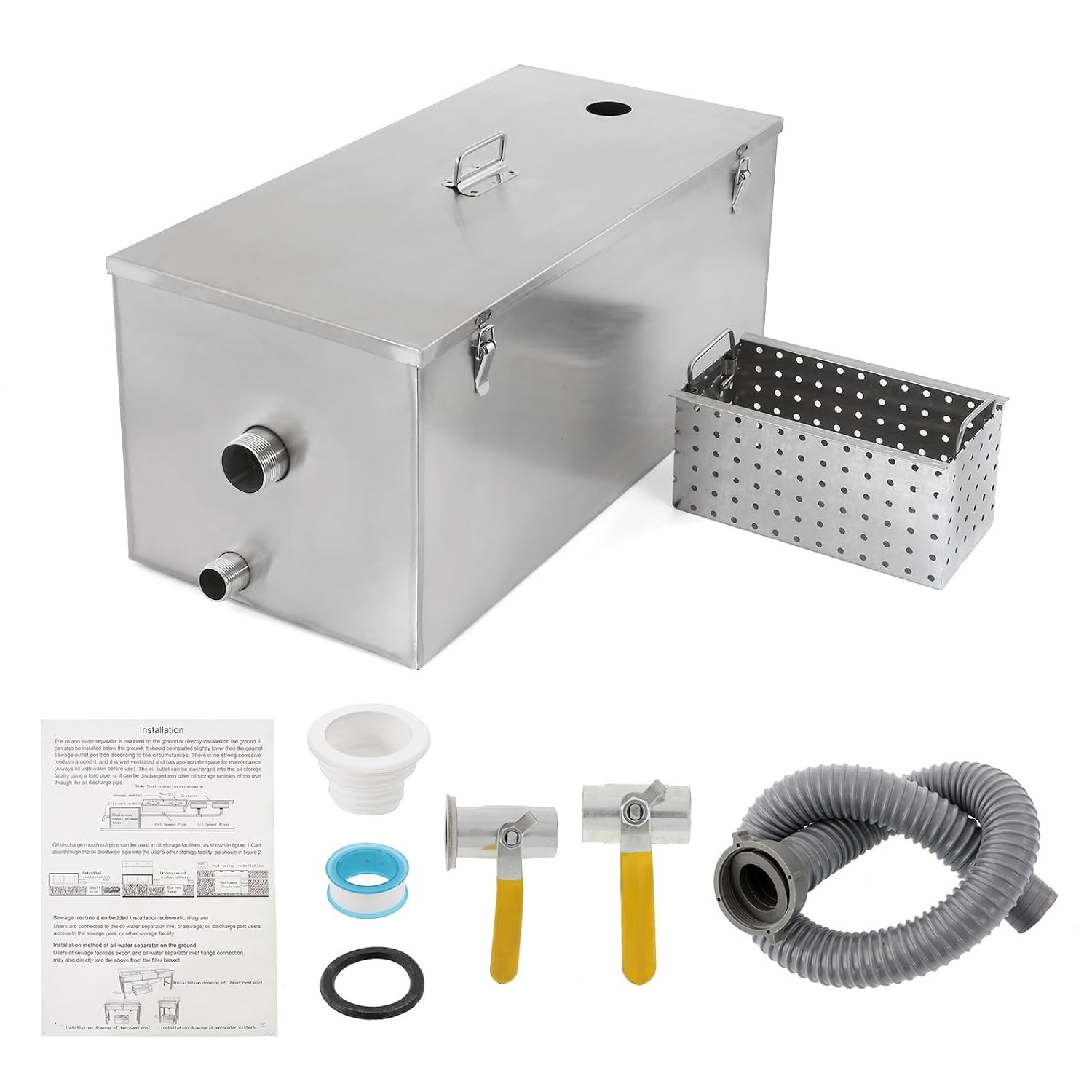 Fácil de instalar: las trampas de grasa BEAMNOVA se entregan completamente montadas y no pueden ser más fáciles de instalar. Simplemente conecte la tubería de los fregaderos y el lavavajillas a la entrada de la trampa de grasa. Luego canalice la salida de la trampa de grasa directamente al desagüe. Recomendamos que la tubería de soldadura solvente se utilice para un ajuste seguro. Además, asegúrese de que la trampa esté en el piso plano.