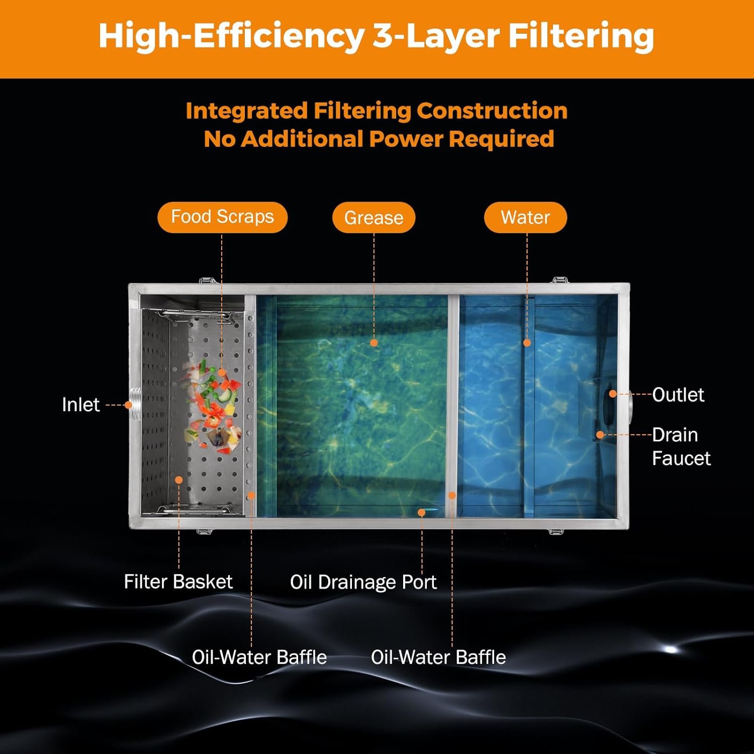 Estos FOG se retienen dentro de la unidad junto con partículas de alimentos y fluye agua limpia debajo de las placas deflectoras a través de la unidad para drenar. Los residuos retenidos recogidos dentro de la unidad se pueden eliminar fácilmente a intervalos regulares utilizando la malla fina extraíble. Comprueba cuidadosamente las especificaciones de este producto antes de comprar para asegurarte de que cumple con tus regulaciones locales.