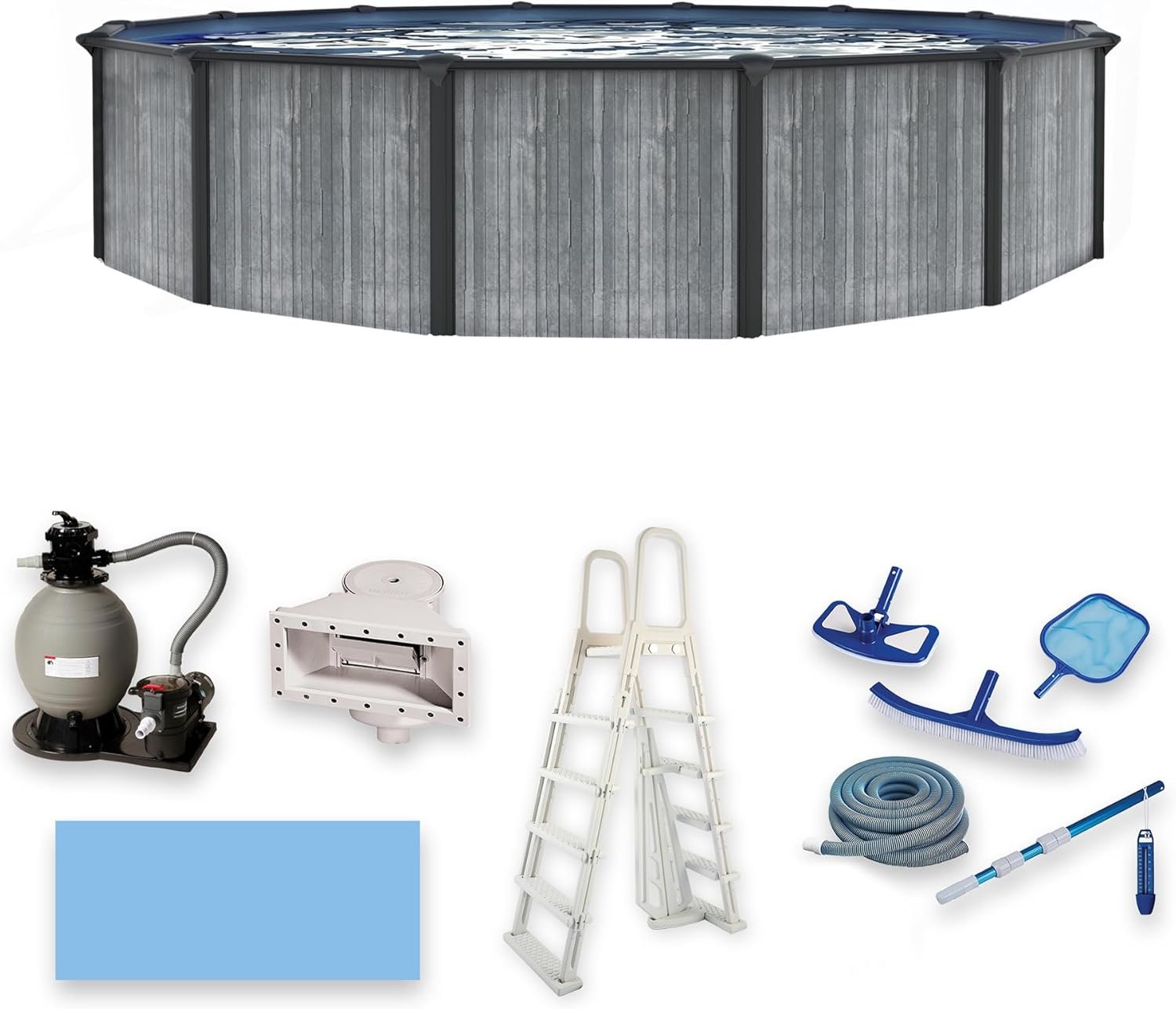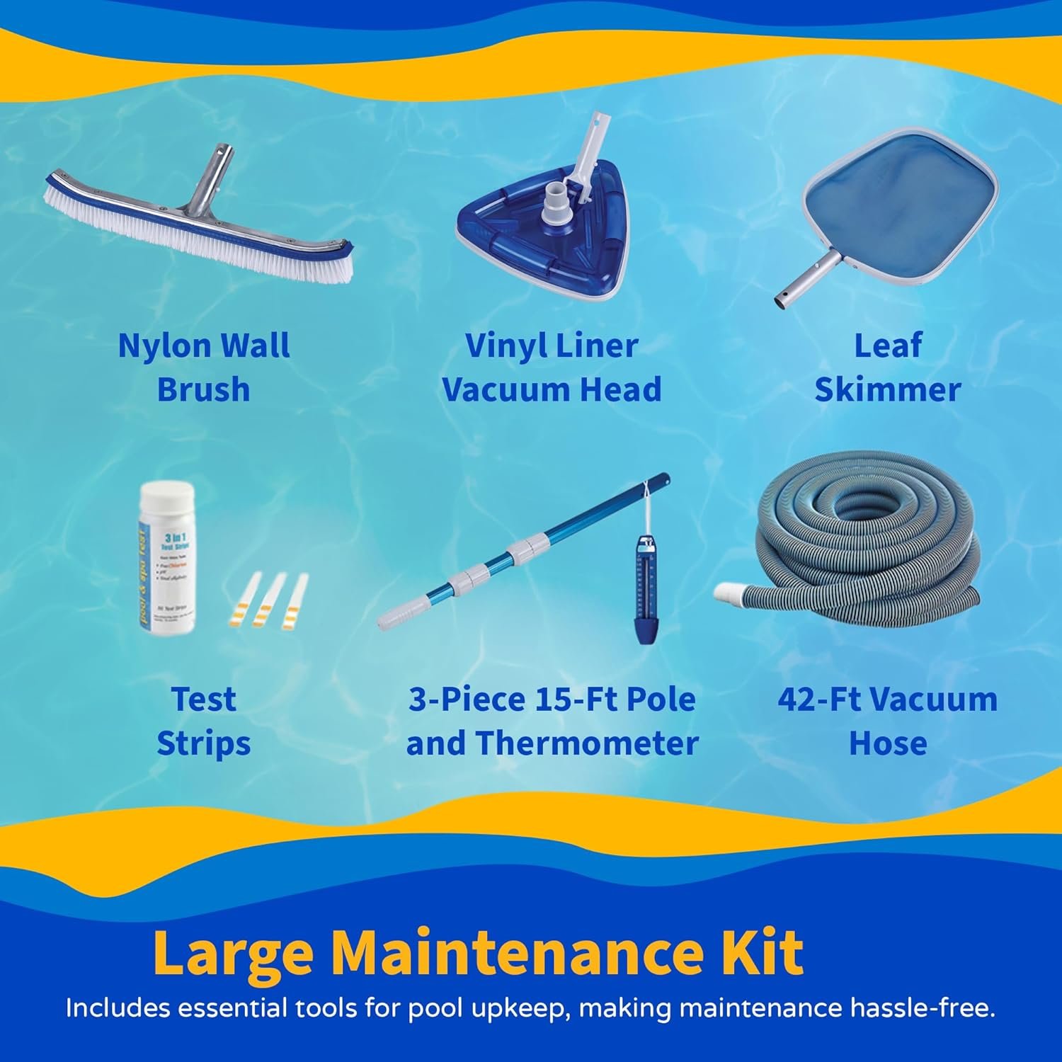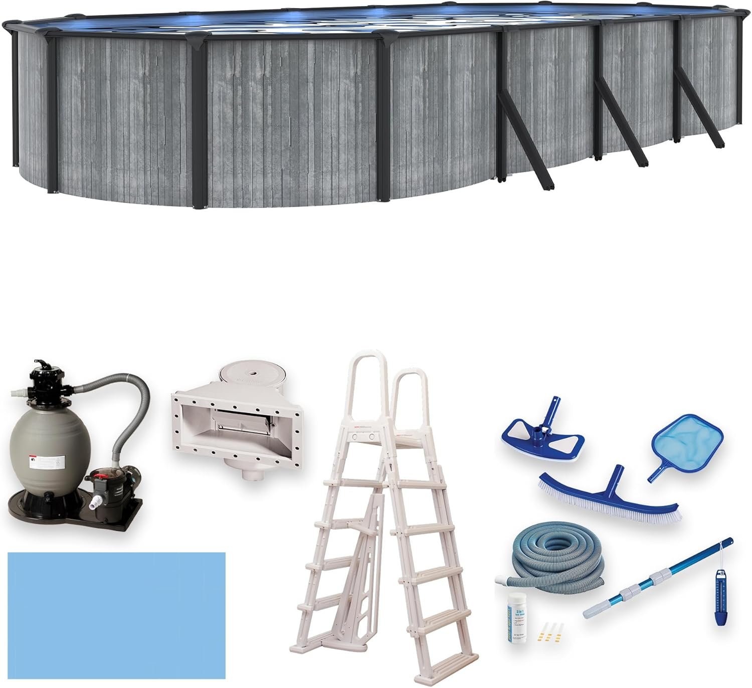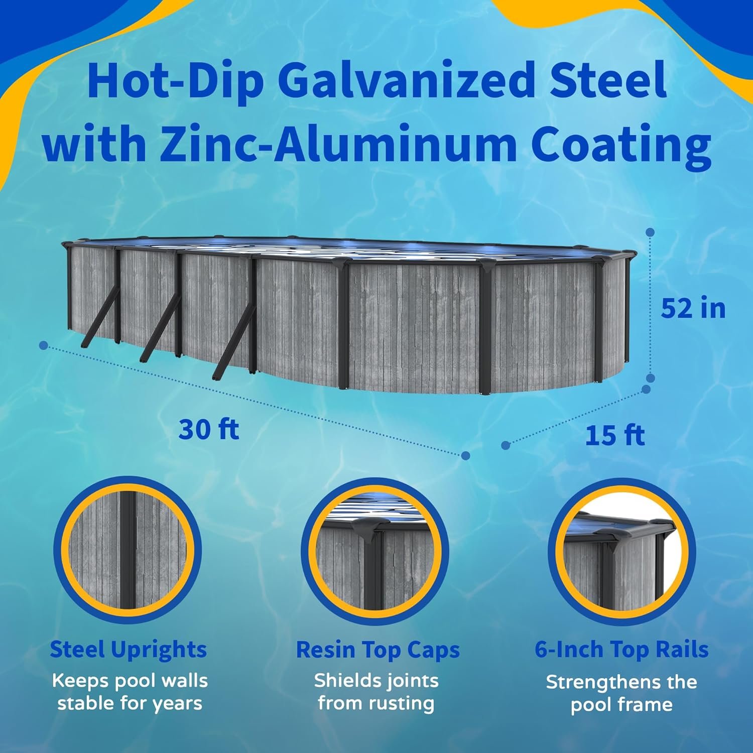 Juego completo de piscina sobre el suelo: la piscina ovalada de San Pedro de 15 x 30 pies cuenta con una pared de acero de 52 pulgadas y montantes de 6 pulgadas para mayor durabilidad. Incluye un sistema de filtro de arena, forro azul, skimmer, escalera de marco A y kit de mantenimiento.