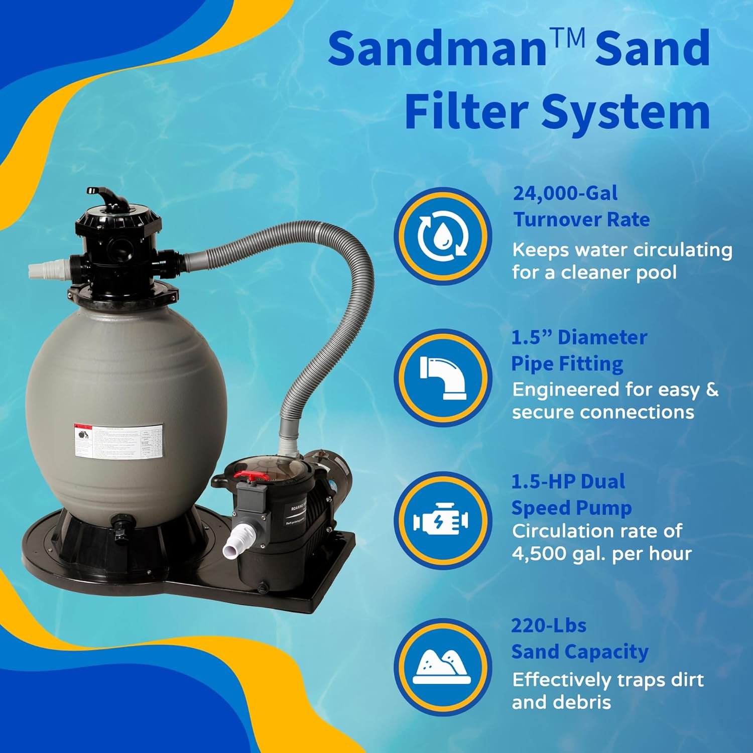 Filtración de agua eficiente: el sistema de filtro de piscina de arena Sandman garantiza agua limpia con una tasa de rotación de 24,000 galones 4,500 galones/hora. Su bomba de doble velocidad de 1 HP proporciona eficiencia energética, mientras que el skimmer y el kit de mantenimiento simplifican la limpieza.