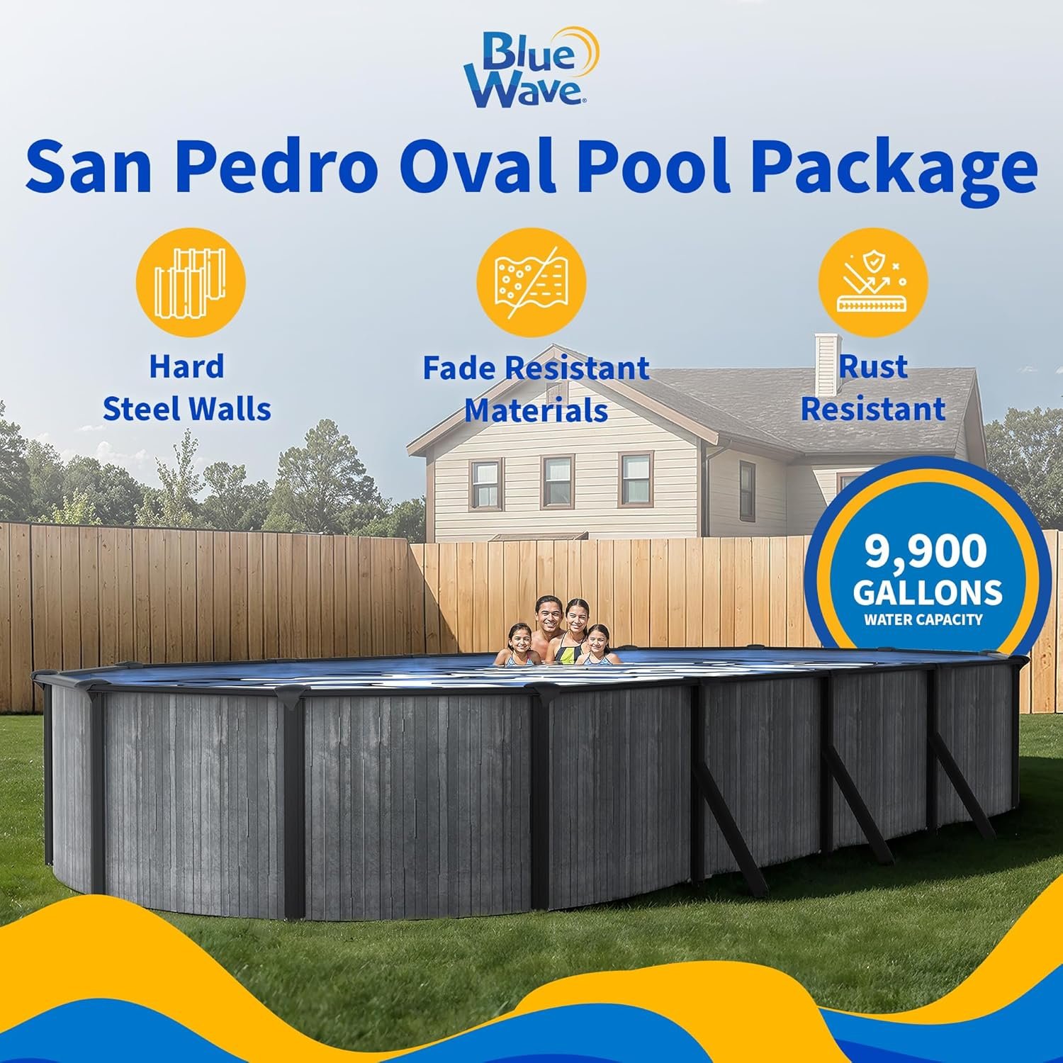 Blue Wave San Pedro – Riel superior ovalado de 15 x 30 pies, 52 pulgadas de profundidad, 6 pulgadas de profundidad, paquete de piscina de pared de acero sobre el suelo