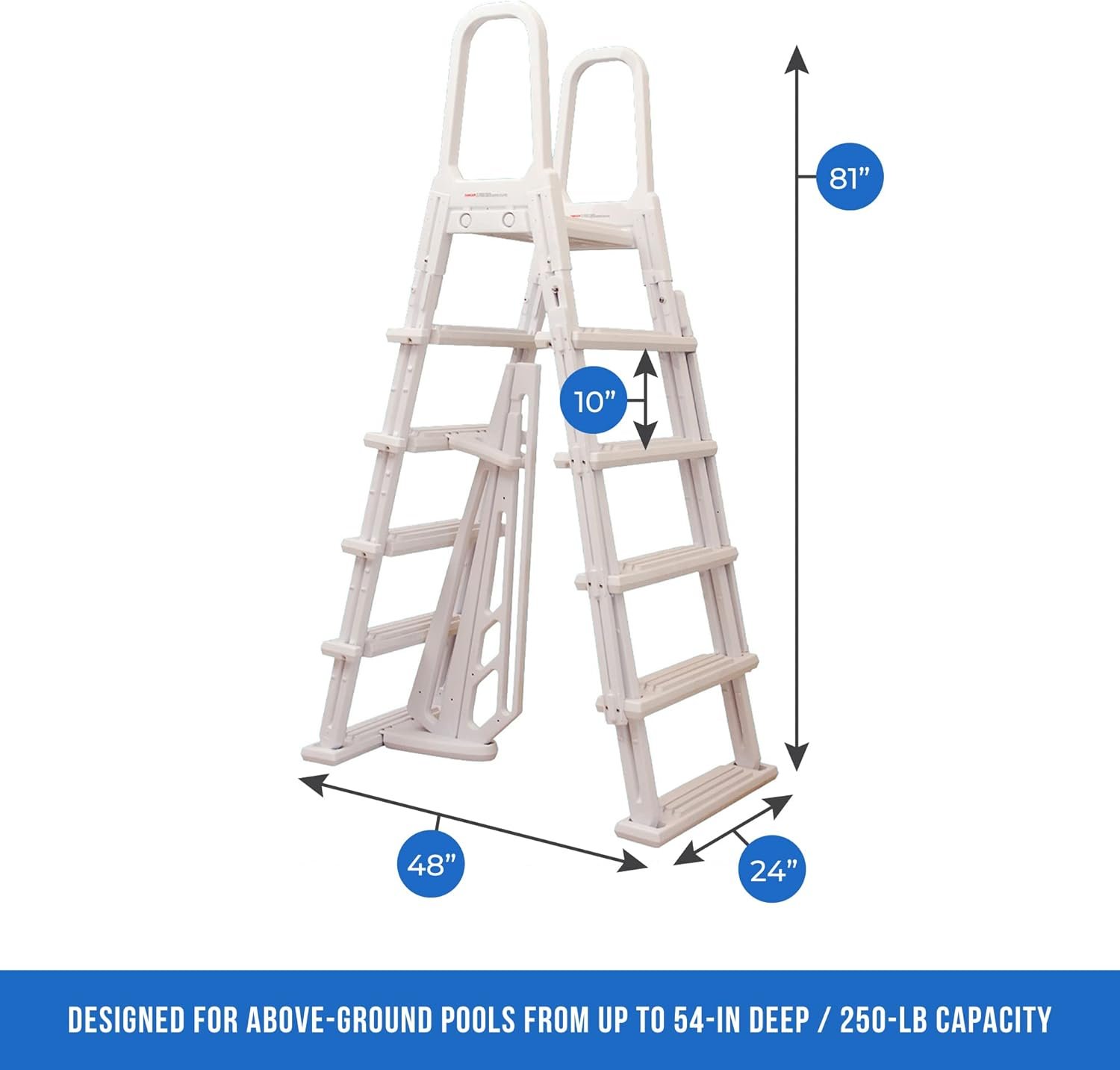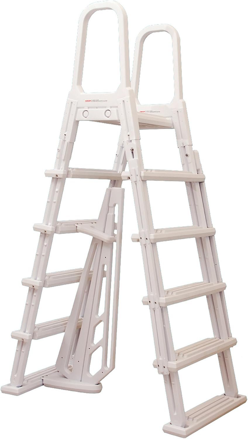 Segura y fácil de entrar: la escalera con marco en A, hecha de resina resistente, soporta hasta 250 libras y cuenta con escalones abatibles para mayor seguridad cuando no está en uso. Su amplia plataforma hace que entrar y salir de la piscina sobre el suelo sea seguro para toda la familia.