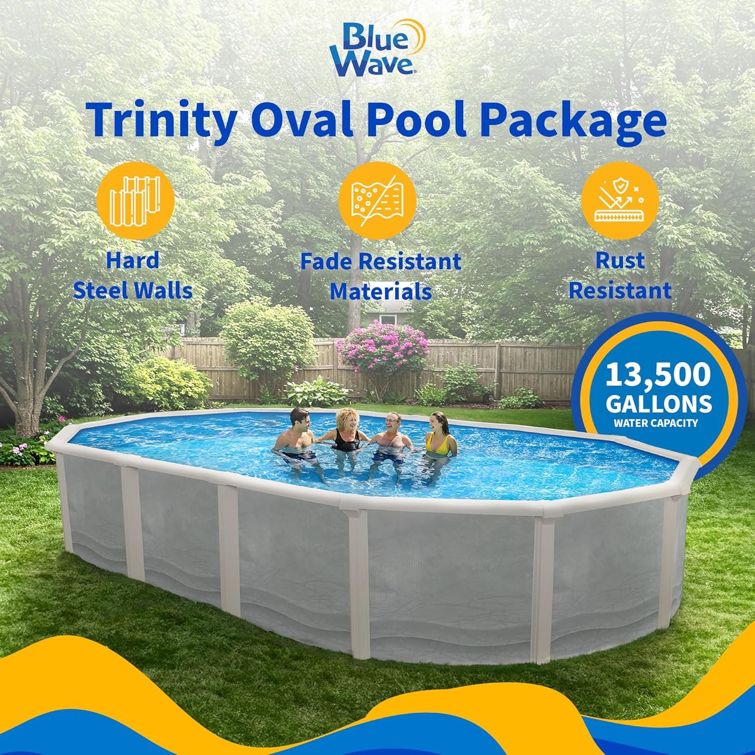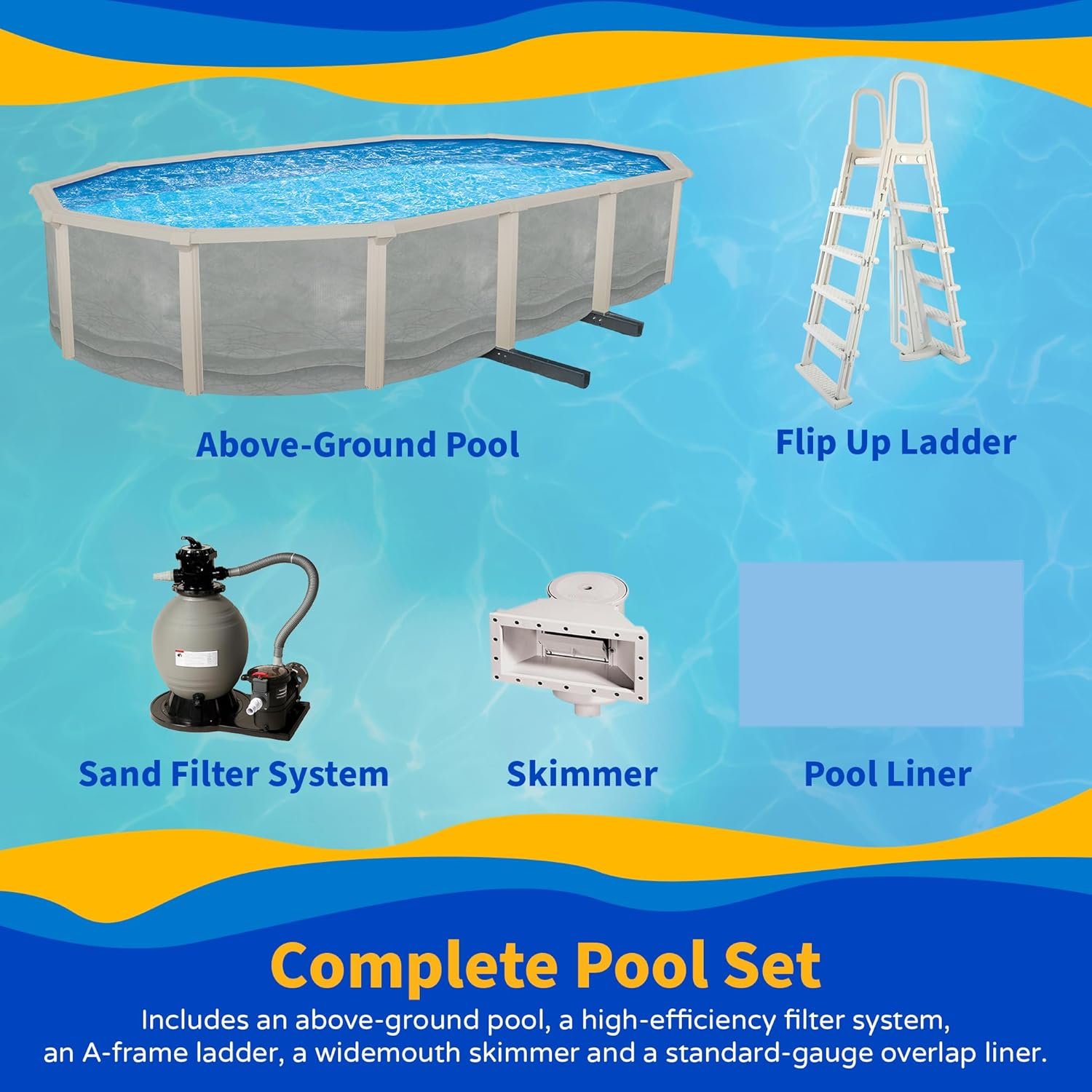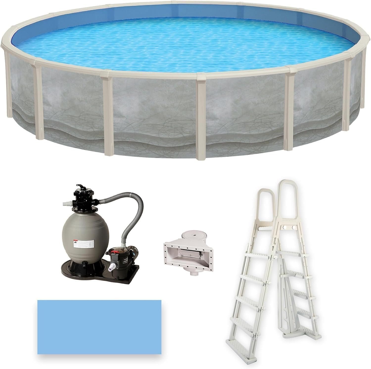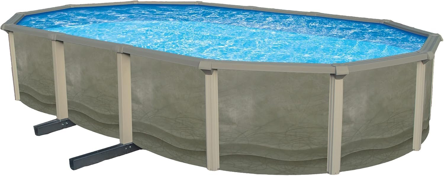 Blue Wave Trinity – Piscina ovalada de 18 pies x 33 pies de profundidad sobre el suelo, pared de acero, rieles superiores, filtro de arena, desnatador, forro, escalera con marco en A y espumadera