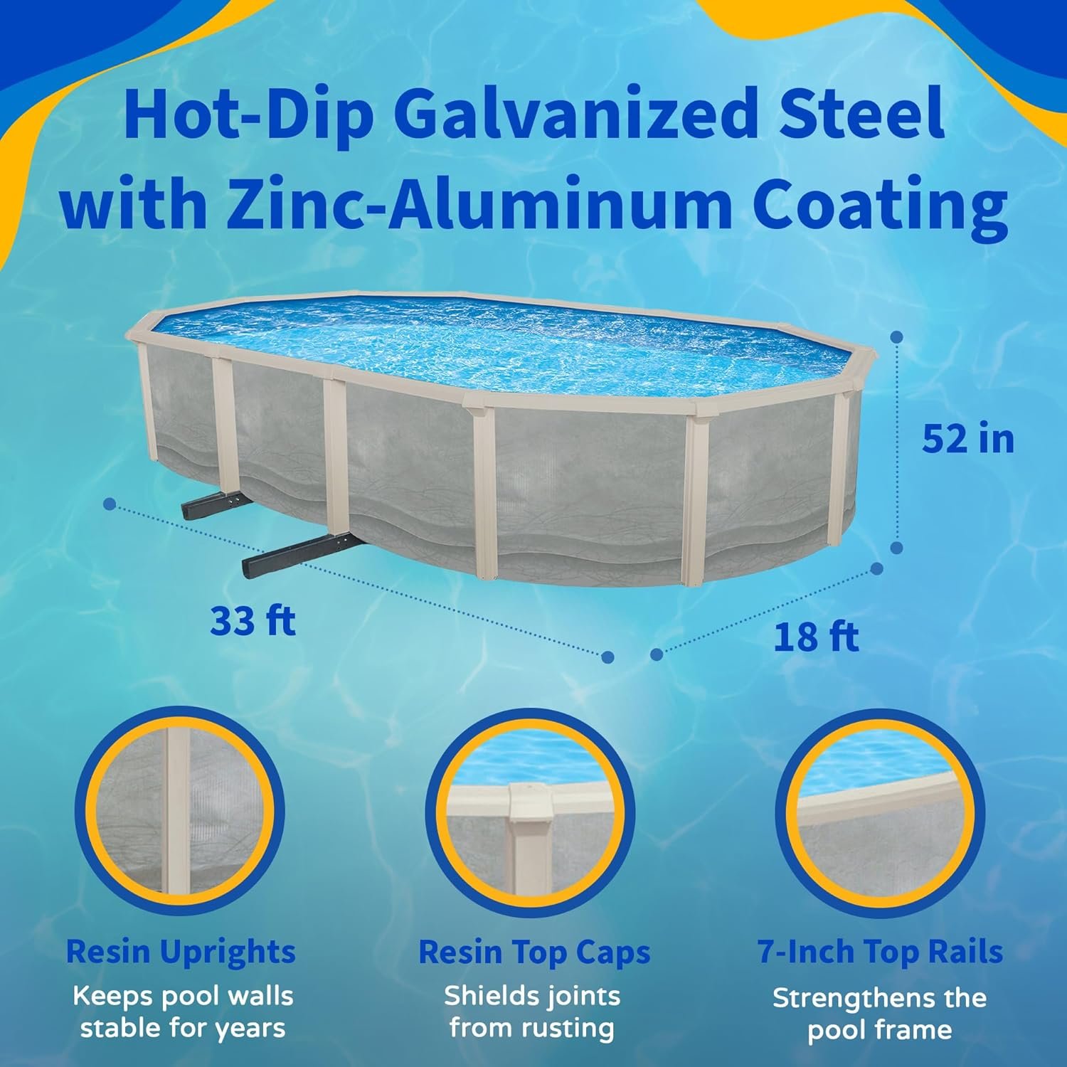 Construcción resistente a la intemperie: esta piscina al aire libre cuenta con un conjunto completo de rieles de resina, juntas, tapas superiores y montantes que garantizan una resistencia superior a la exposición al sol. Las paredes de acero galvanizado de 0.018 in con revestimiento de zinc-aluminio proporcionan una larga durabilidad.