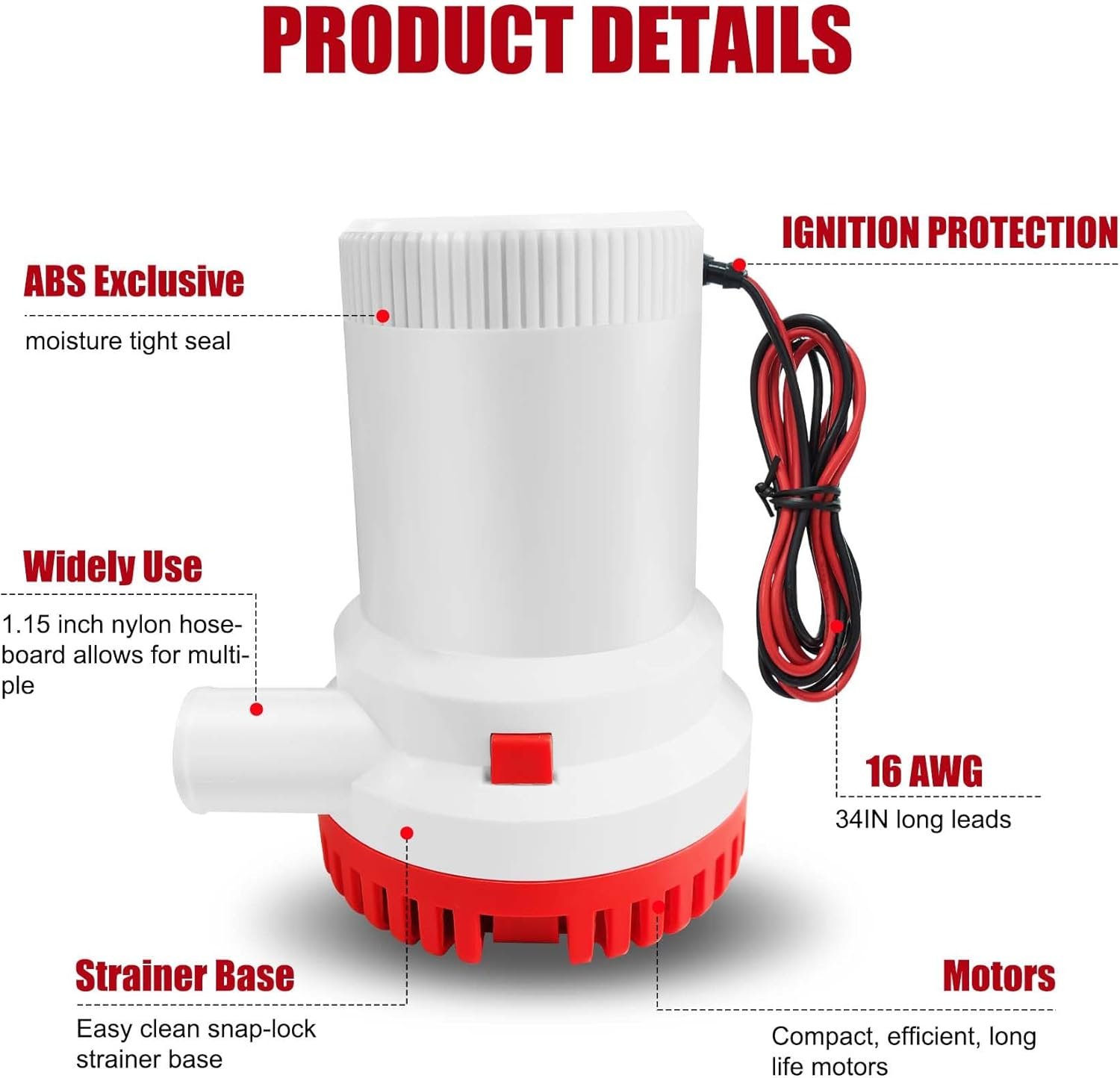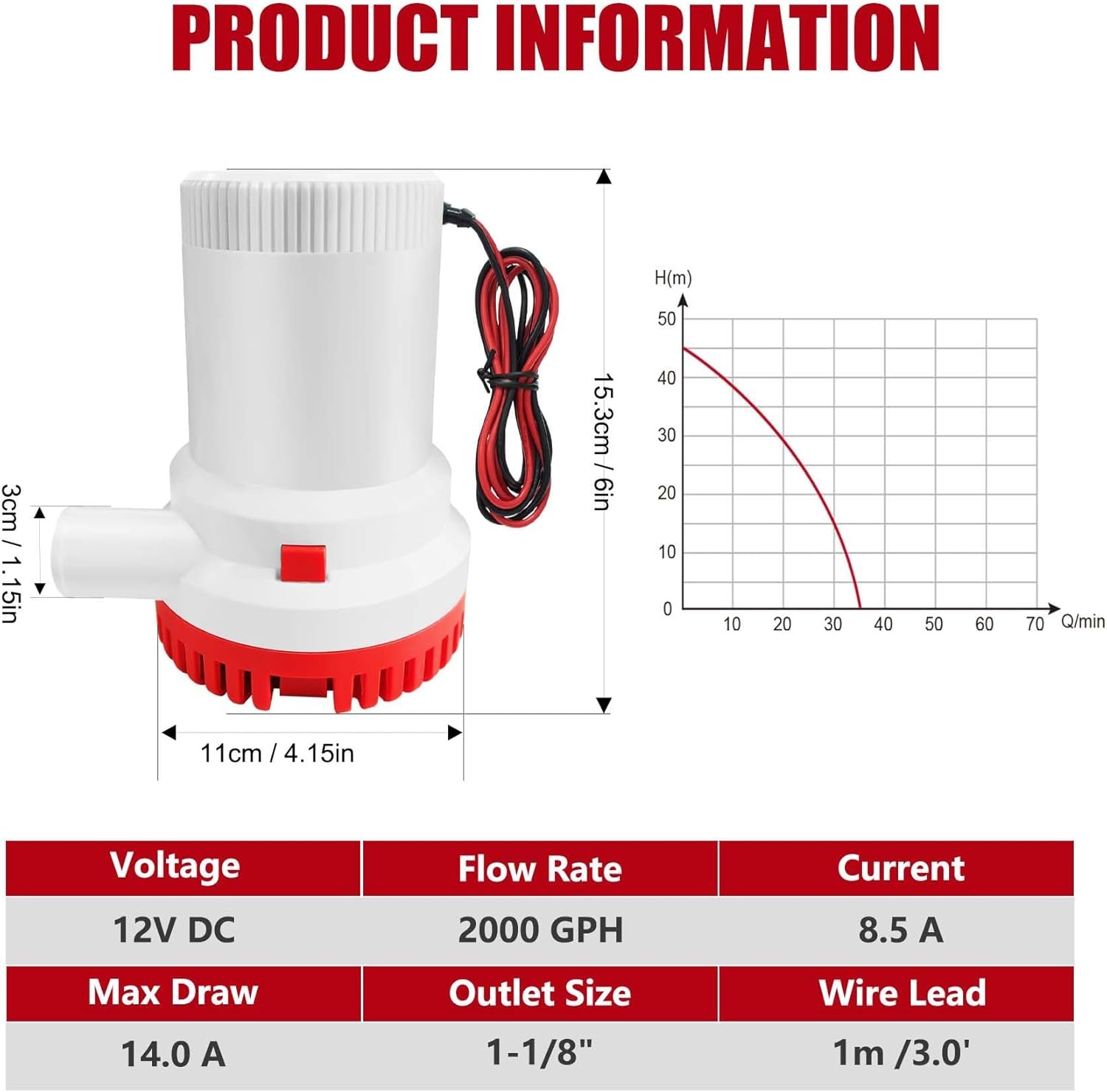 Bomba de sentina de 2000 GPH, bomba de sentina sumergible para barcos y aplicaciones marinas de 12 voltios para embarcaciones marinas
