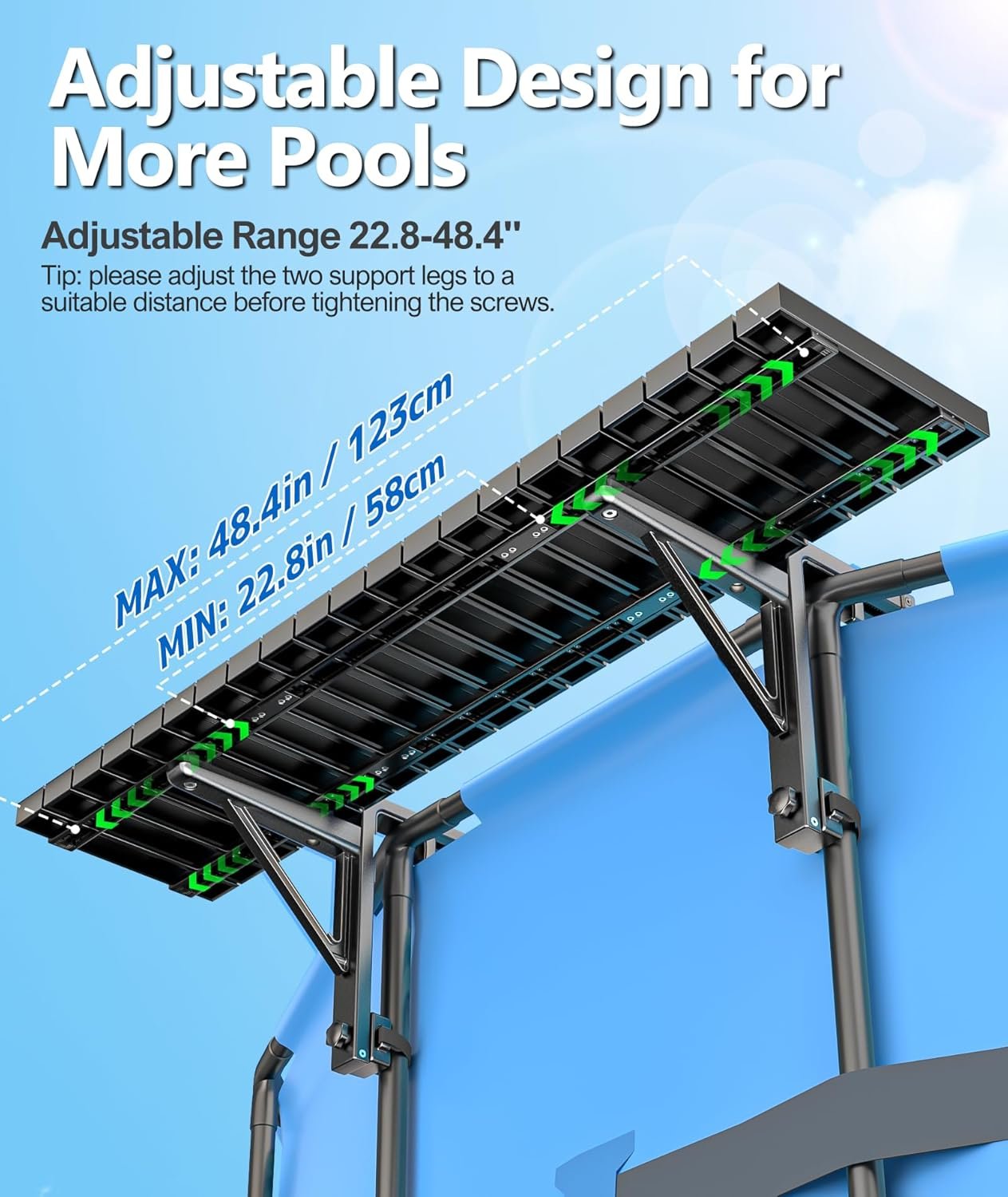 Ajuste ajustable para varios espacios: diseñados con un rango ajustable de 22.8 a 48.4 pulgadas entre las patas de soporte, los accesorios de piscina BoYata sobre el suelo se adaptan sin esfuerzo a diferentes tamaños de piscina sobre el suelo y barandillas de balcón. Además, las almohadillas de silicona suave protegen las paredes de la piscina y las barandillas de arañazos y desgaste, asegurando una protección a largo plazo.
