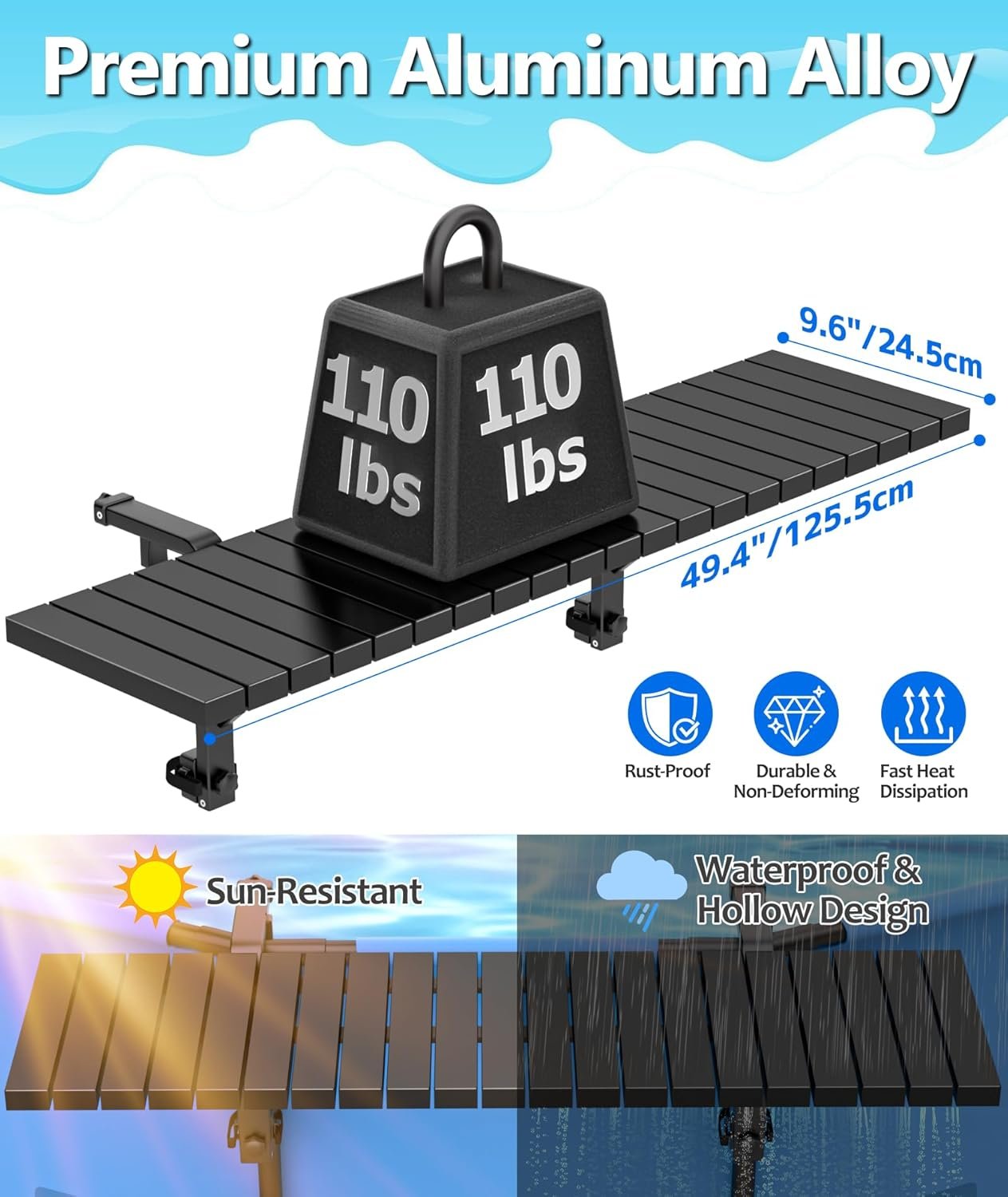 Aleación de aluminio para máxima durabilidad: hecha de aleación de aluminio de alta calidad y materiales ABS, nuestra mesa auxiliar de piscina es excepcionalmente resistente, soporta hasta 110 libras sin doblarse ni deformarse. Sostiene sin esfuerzo bebidas, aperitivos, altavoces y mucho más. Sus propiedades impermeables, resistentes al óxido y a los rayos UV garantizan durabilidad en todo tipo de clima, por lo que es un esencial duradero para tu refugio junto a la piscina