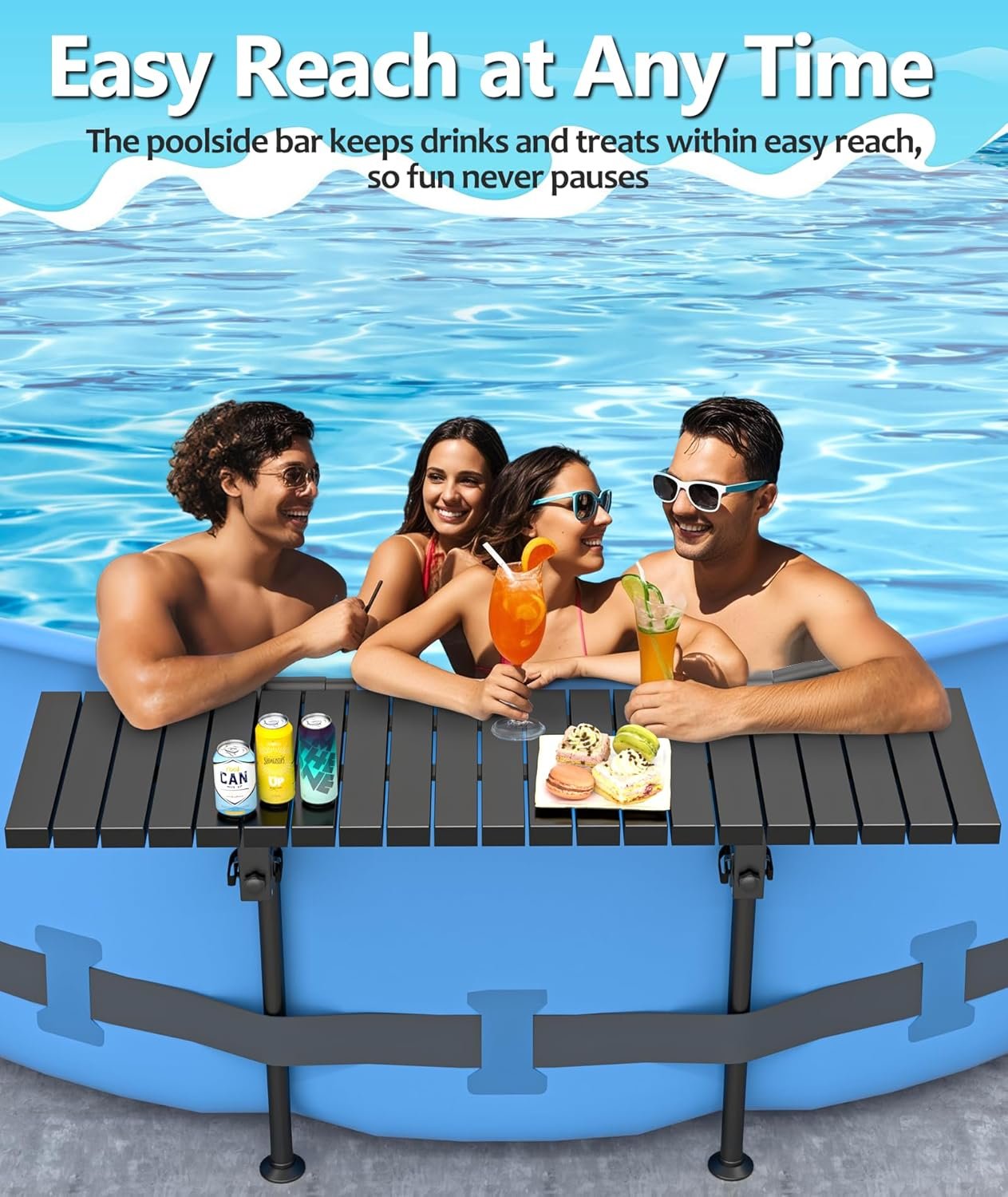 MESA ESPACIOSA Y VERSÁTIL: Con una generosa superficie de 49.4 x 9.6 pulgadas, esta barra lateral de piscina ofrece un amplio espacio para todos tus elementos esenciales, di adiós al almacenamiento limitado. Más allá de la piscina, la barra de natación se transforma perfectamente en una mesa de barandilla de balcón para un espacio de trabajo informal o relajante rincón de café, comedor o estante para plantas. Una mesa desbloquea la diversión junto a la piscina y la elegante vida en el balcón.
