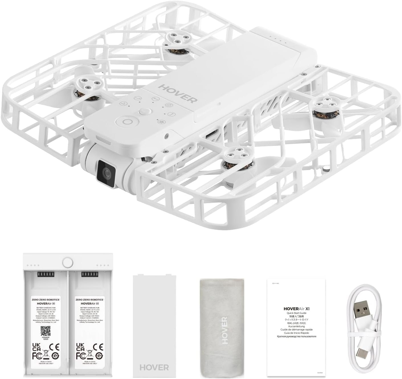 Componentes incluidos: 1 bolsa de almacenamiento, 1 cable USB, 1 concentrador de carga de batería, Batería X2, HOVERAir 1 cámara autovoladora con batería