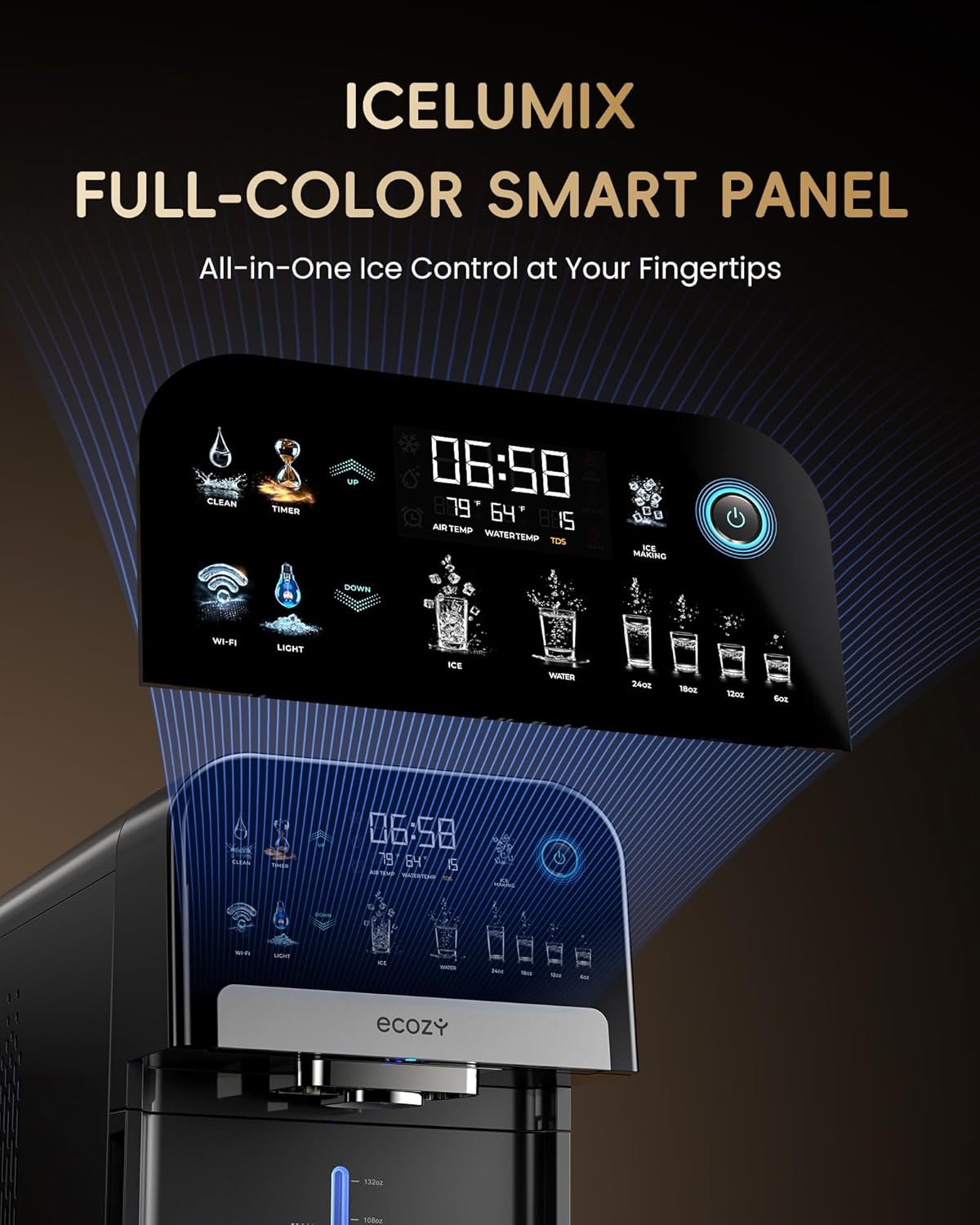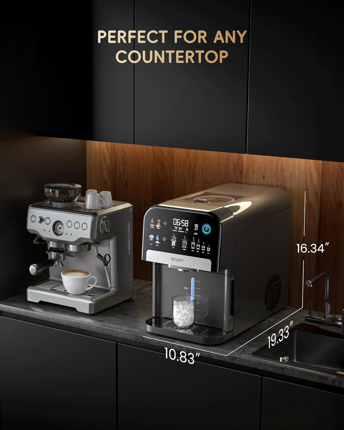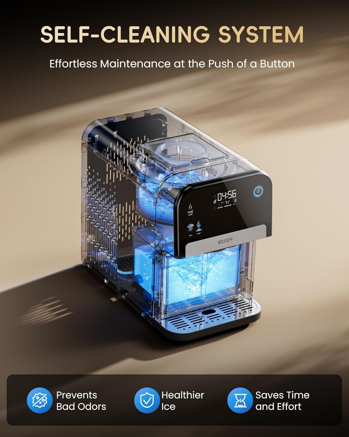 ecozy Dispensador de máquina de hielo Nugget, máquina de hielo inteligente 2 en 1 para encimera y dispensador de agua con control de aplicación, autolimpieza, iluminación automática, monitor TDS