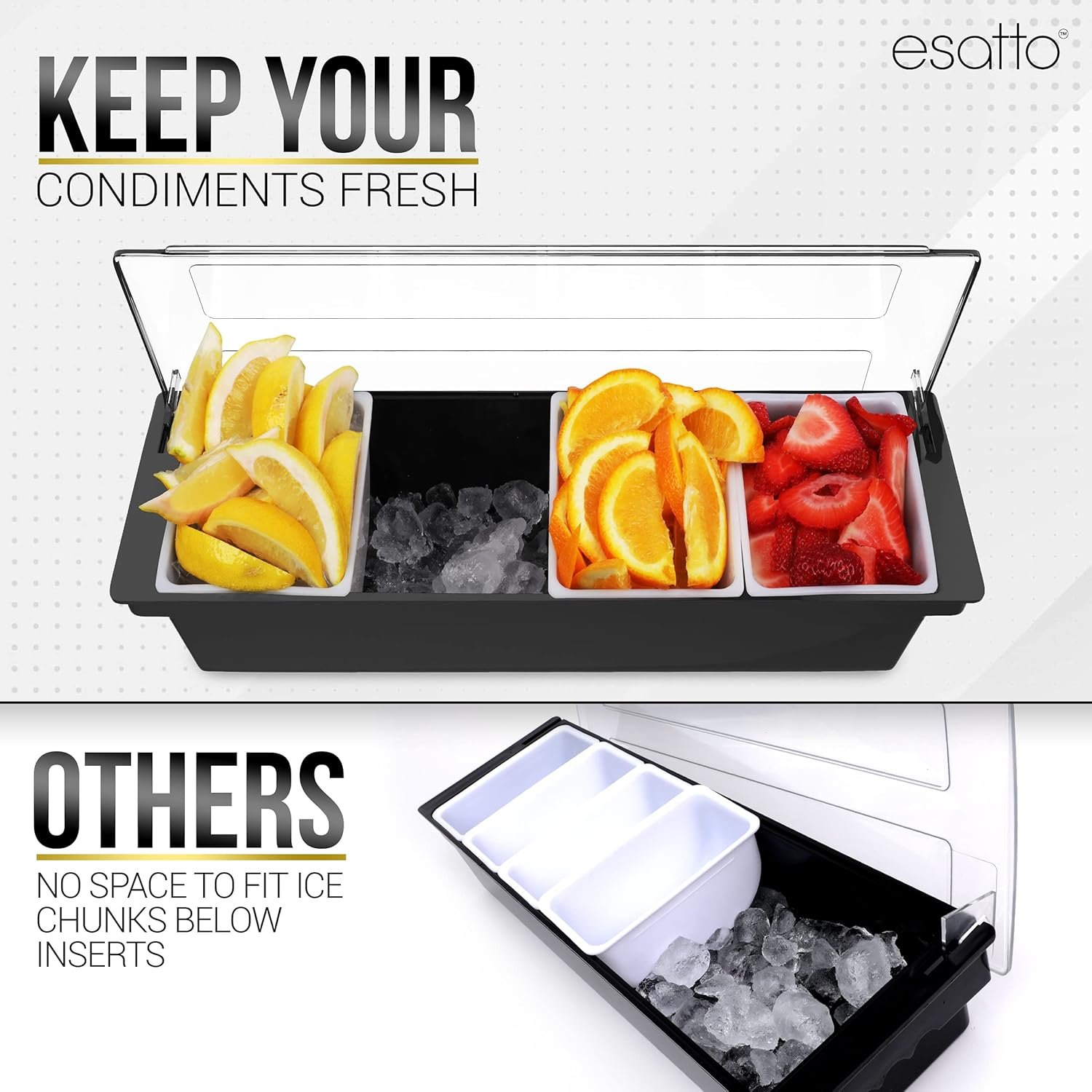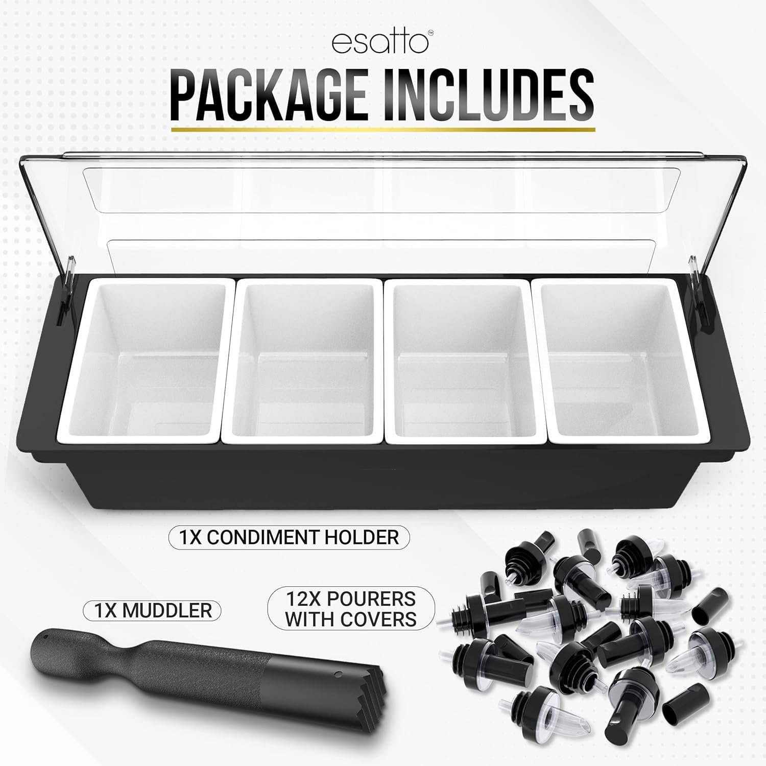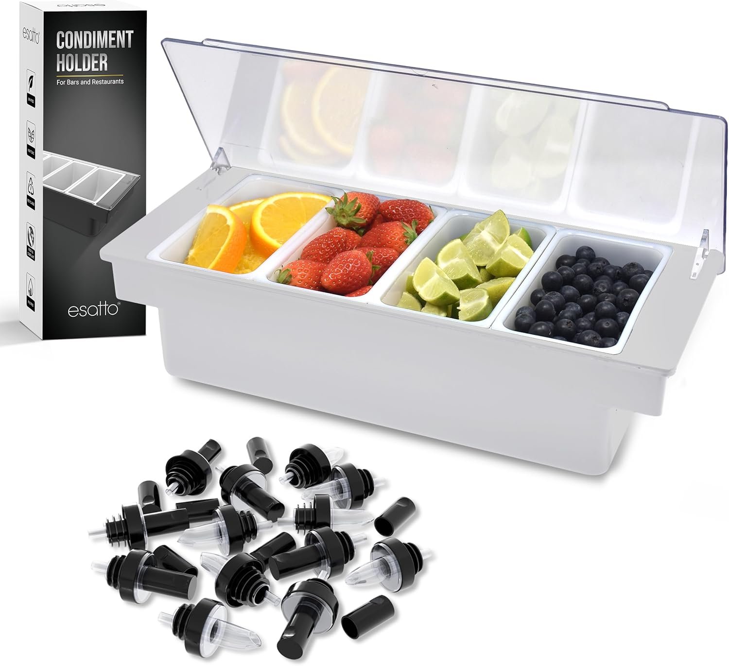 Esatto Suministros de bar Recipientes de condimentos con tapas 4-1.5 pintas, accesorios para carrito de barra, bandeja de frutas, bandeja de condimentos, estación de cobertura de pizza con 12