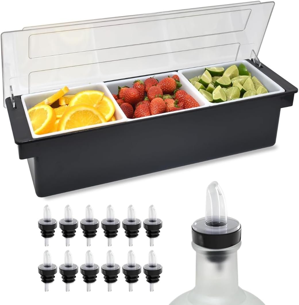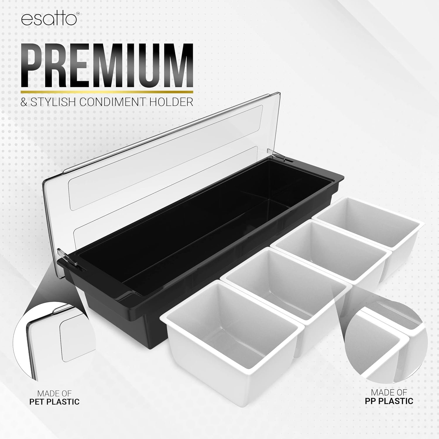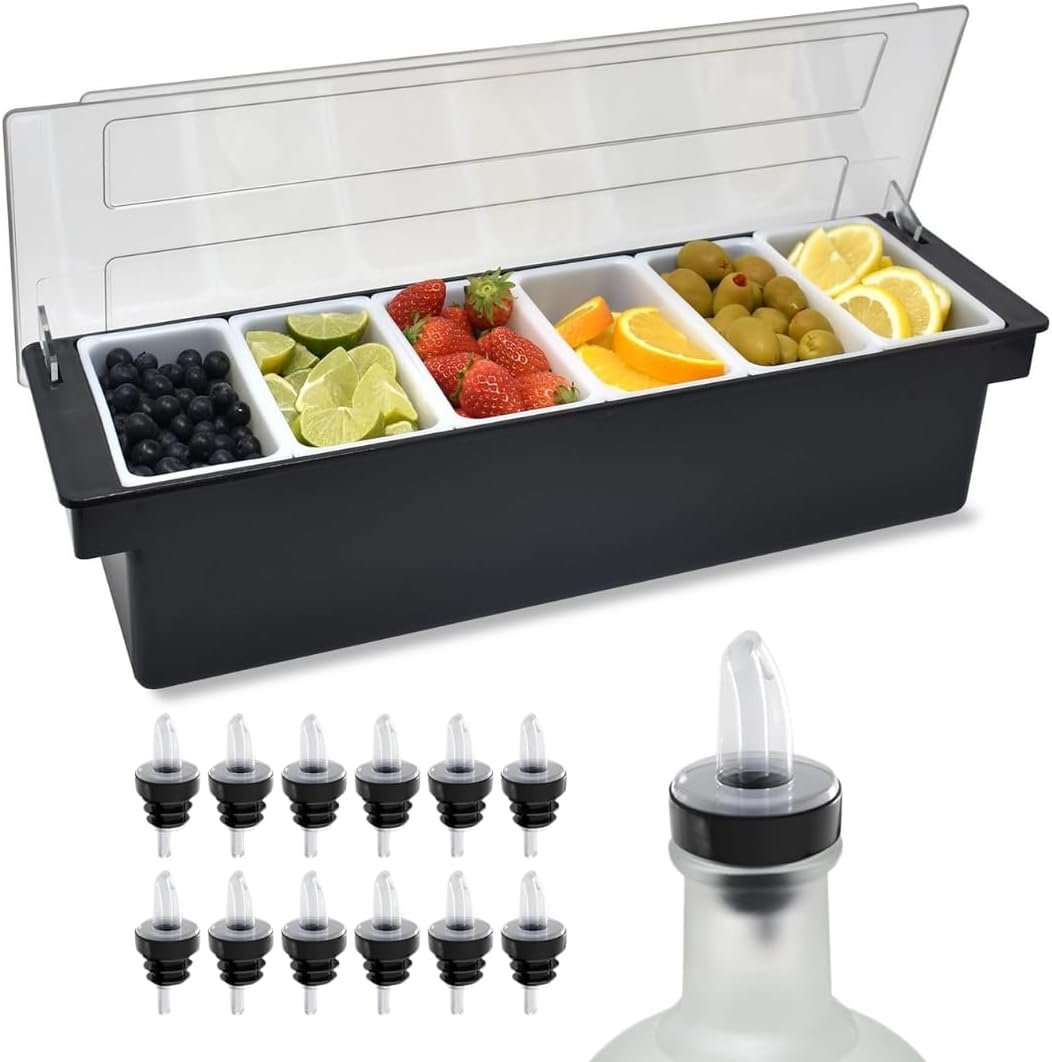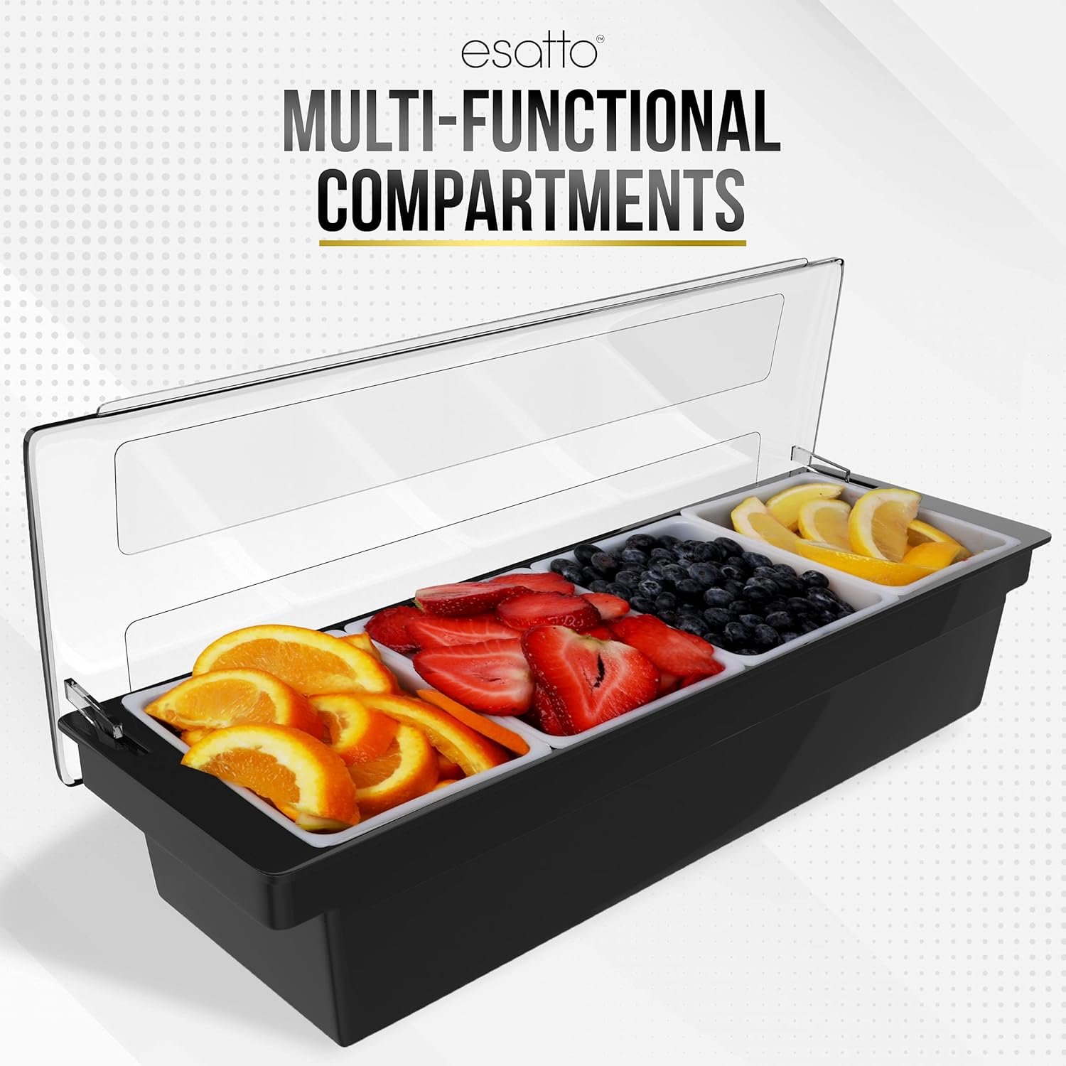 Esatto Suministros de bar Recipientes de condimentos con tapas 4-1.5 pintas, accesorios para carrito de barra, bandeja de frutas, bandeja de condimentos, estación de cobertura de pizza con 12