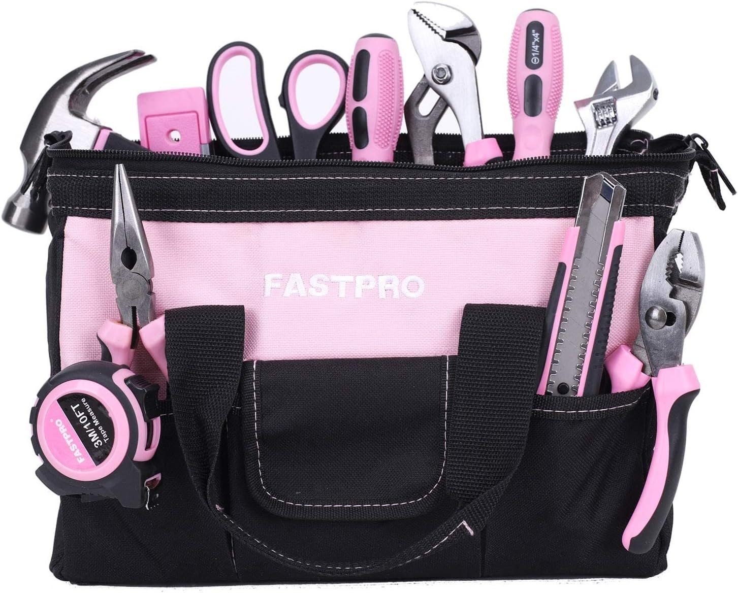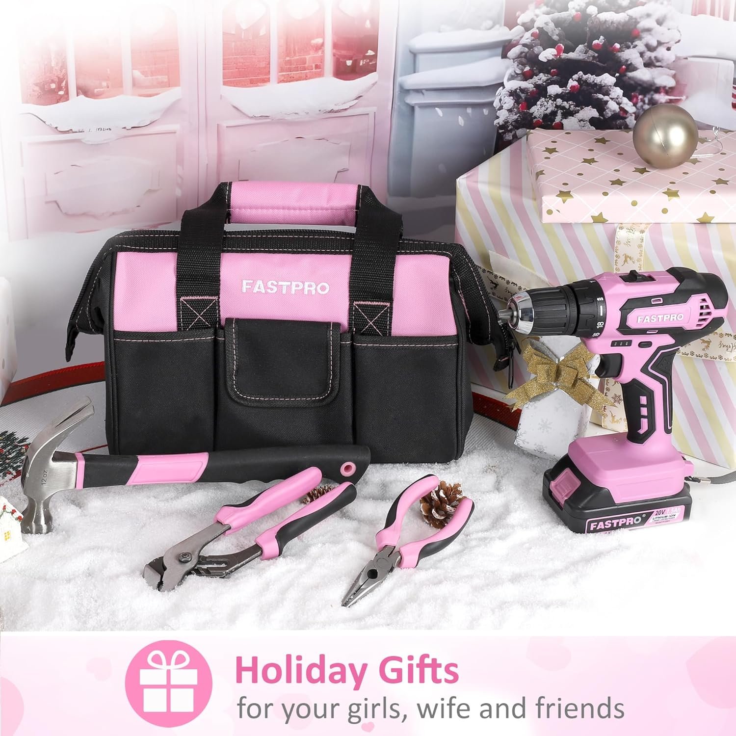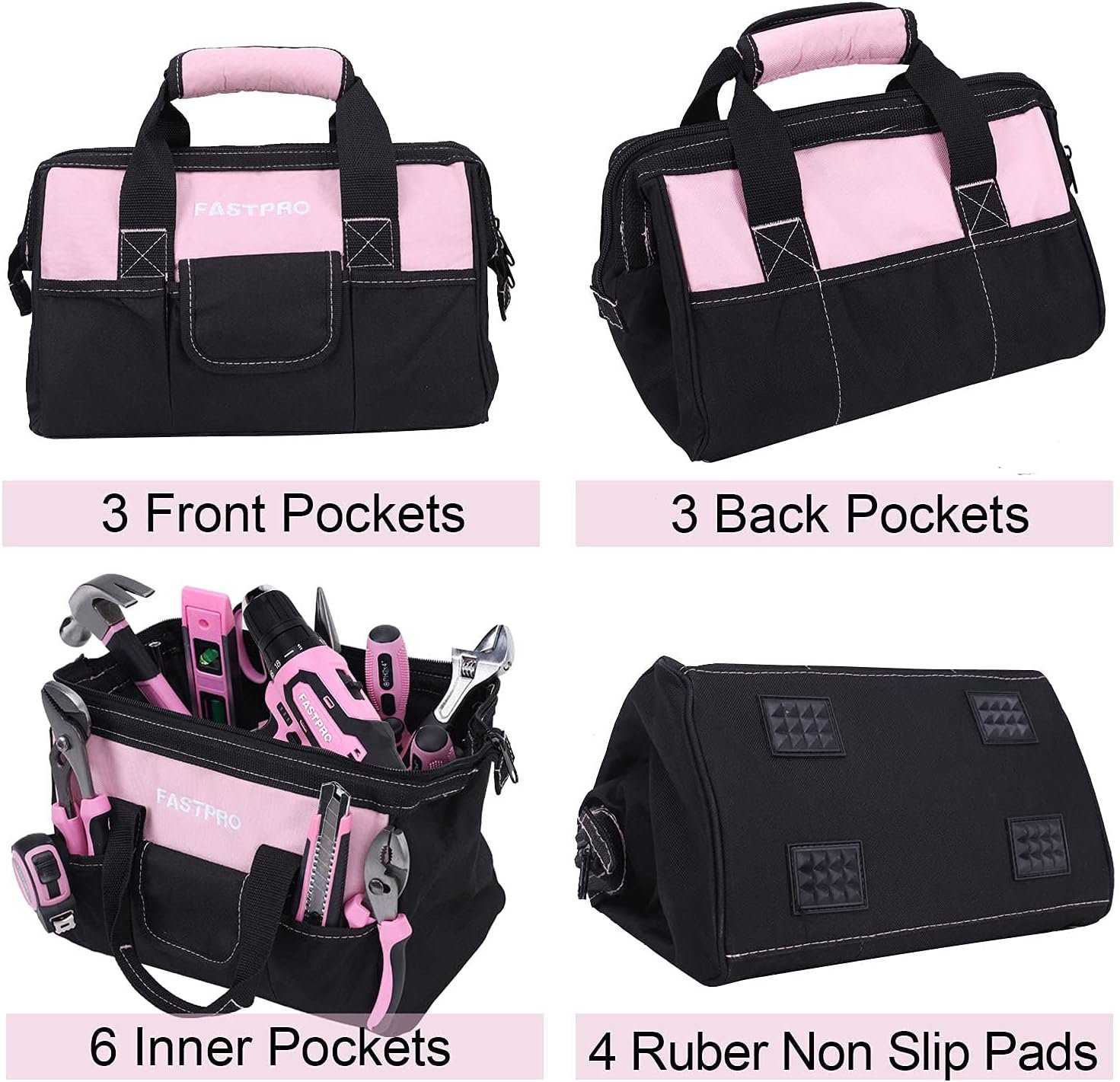 FASTPRO 232 piezas 20 V Rosa inalámbrico Taladro de iones de litio y juego de herramientas para el hogar, kit de herramientas de reparación para el hogar con bolsa de herramientas de almacenamiento abierta de boca ancha de 12 pulgadas