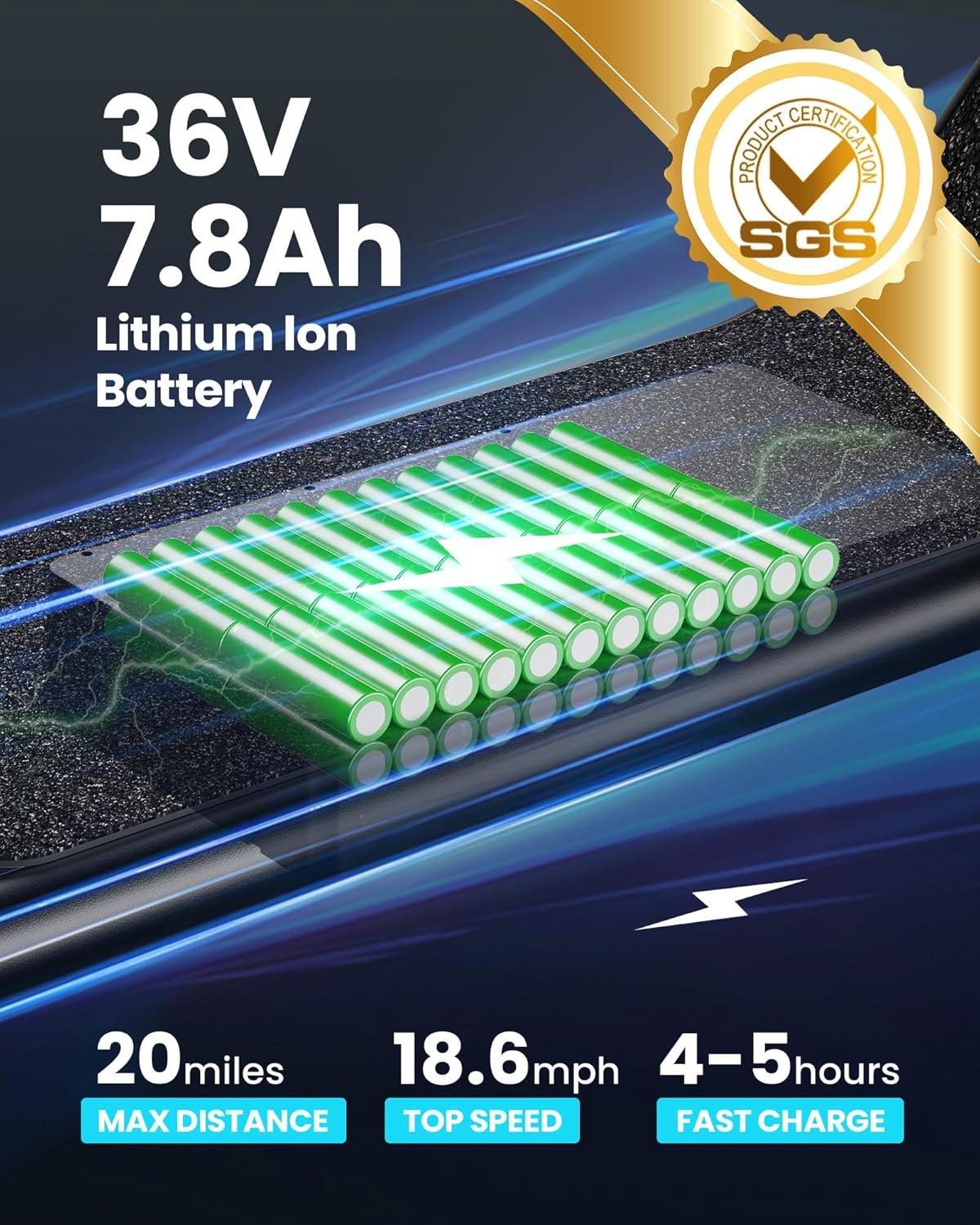 Rendimiento premium: Scooter eléctrico con un potente motor de 550 W y una batería de larga duración para un alcance de hasta 15-20 millas a una velocidad máxima de 18.6 mph. El asiento ajustable se adapta a ciclistas de 5 pies 1 pulgada a 6 pies 1 pulgadas, y el material suave y transpirable garantiza un viaje cómodo y sin fatiga.