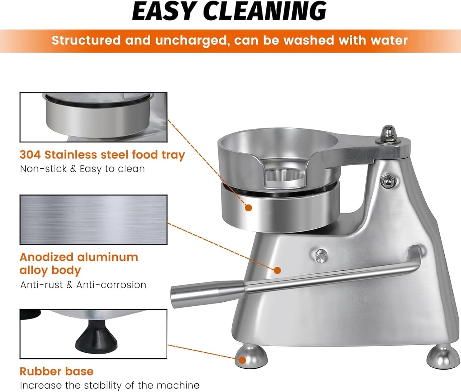 - Alta eficiencia: con una capacidad de hasta 500 hamburguesas por hora, esta máquina de prensa de hamburguesas está diseñada para producir grandes cantidades, por lo que es perfecta para restaurantes ocupados y camiones de comida.