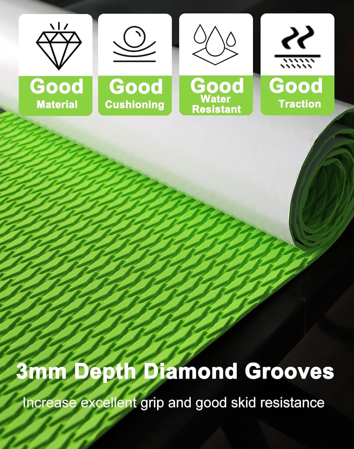 - Almohadilla antideslizante: la alfombrilla de agarre de cubierta cuenta con ranuras de diamante de 0.118 in de profundidad, puede aumentar un excelente agarre y una buena resistencia al deslizamiento, también añade un buen cojín, te da una experiencia segura y libre
