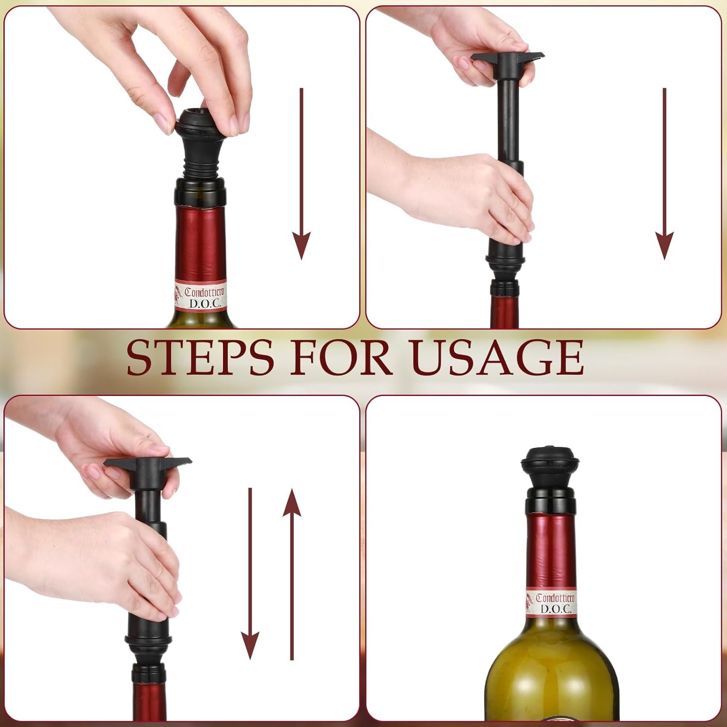 Fácil de usar: necesitas insertar el tapón de vino en la boca de la botella y la bomba de vacío, para eliminar el aire de la botella hasta que escuches un clic, lo que indica que la botella ha sido sellada con éxito y es fácil de usar, ahorrándote más tiempo