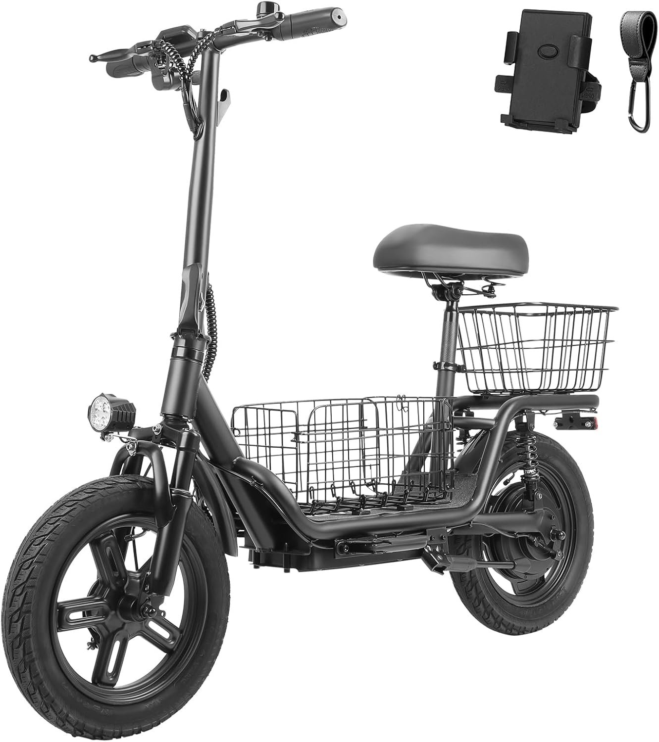 【Paseo ecológico y práctico】Con una cesta resistente para transportar hasta 39.6 libras, este scooter es perfecto para mandados rápidos y viajes de compras. Con su paquete de baterías inteligente, ofrece un alcance de hasta 18.6 millas por carga, incluso en colinas con un ángulo de ascenso de 10 grados. Además, el soporte para teléfono móvil y el gancho incluidos mejoran el uso diario.