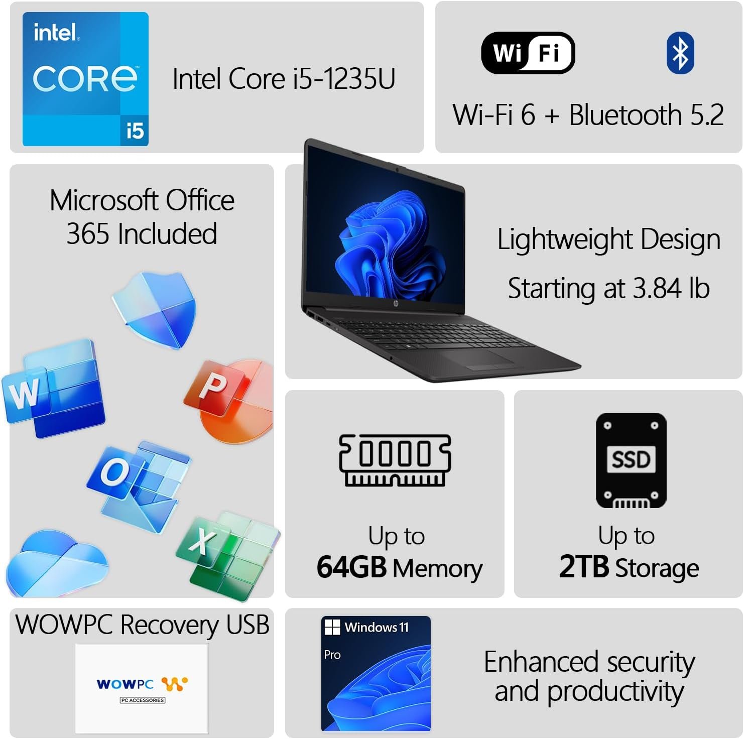 HP 250 G9 15"e; FHD Laptop empresarial, Microsoft Office 365 incluido, procesador Intel Core i5-1235U de 10 núcleos, 32 GB de RAM, 1 TB SSD, puerto Ethernet RJ-45, lector de tarjetas SD, Wi-Fi 6