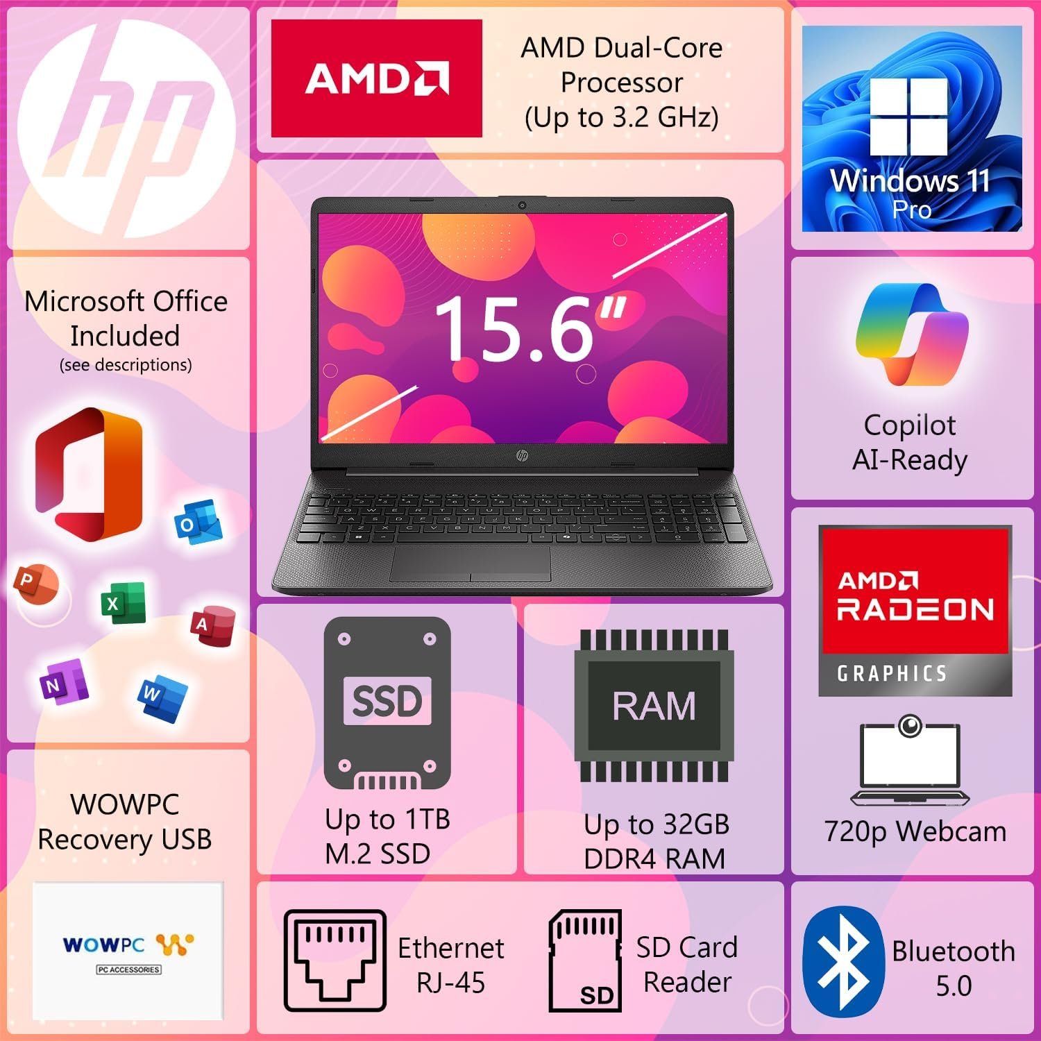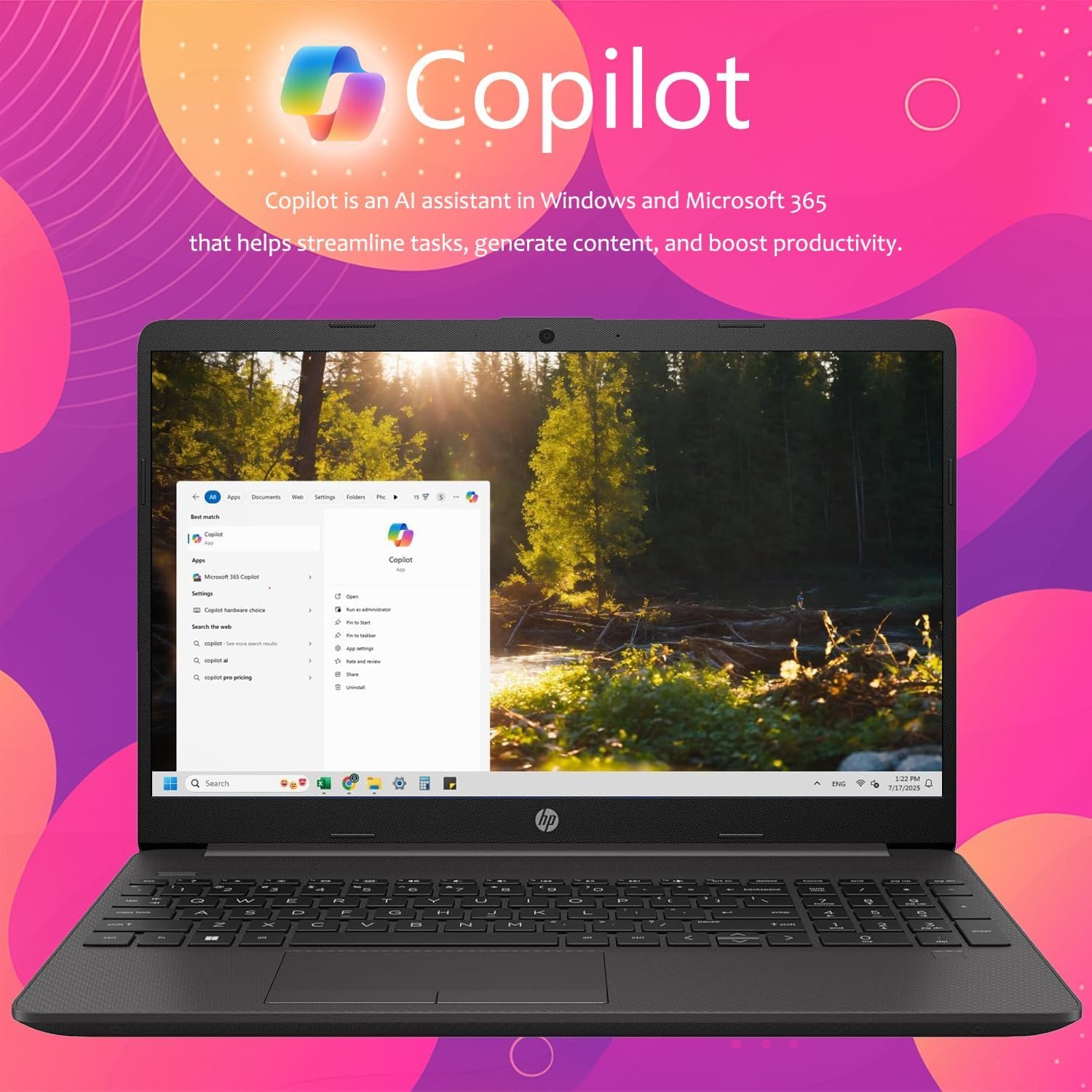 HP Laptop 15 para la escuela, el trabajo y el hogar • Pantalla IPS FHD 1080p de 15.6 pulgadas • Potente procesador AMD • 16 GB de RAM • SSD de 1 TB • Microsoft Office 365 • Copilot AI • Windows 11 Pro
