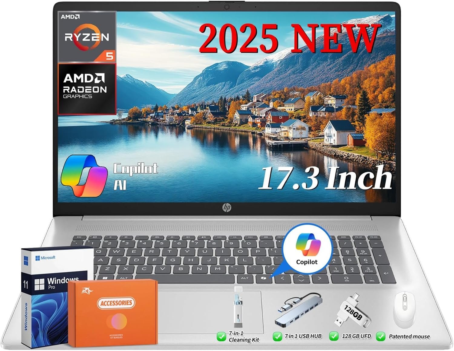 HP Laptop 2025 de 17 pulgadas, pantalla antirreflejos IPS Full HD de 17.3 pulgadas, AMD Ryzen 5 7520U hasta 4.3 GHz, 8 GB DDR5 RAM, 512 GB SSD, gráficos AMD Radeon, llave de copiloto, Wi-Fi 6
