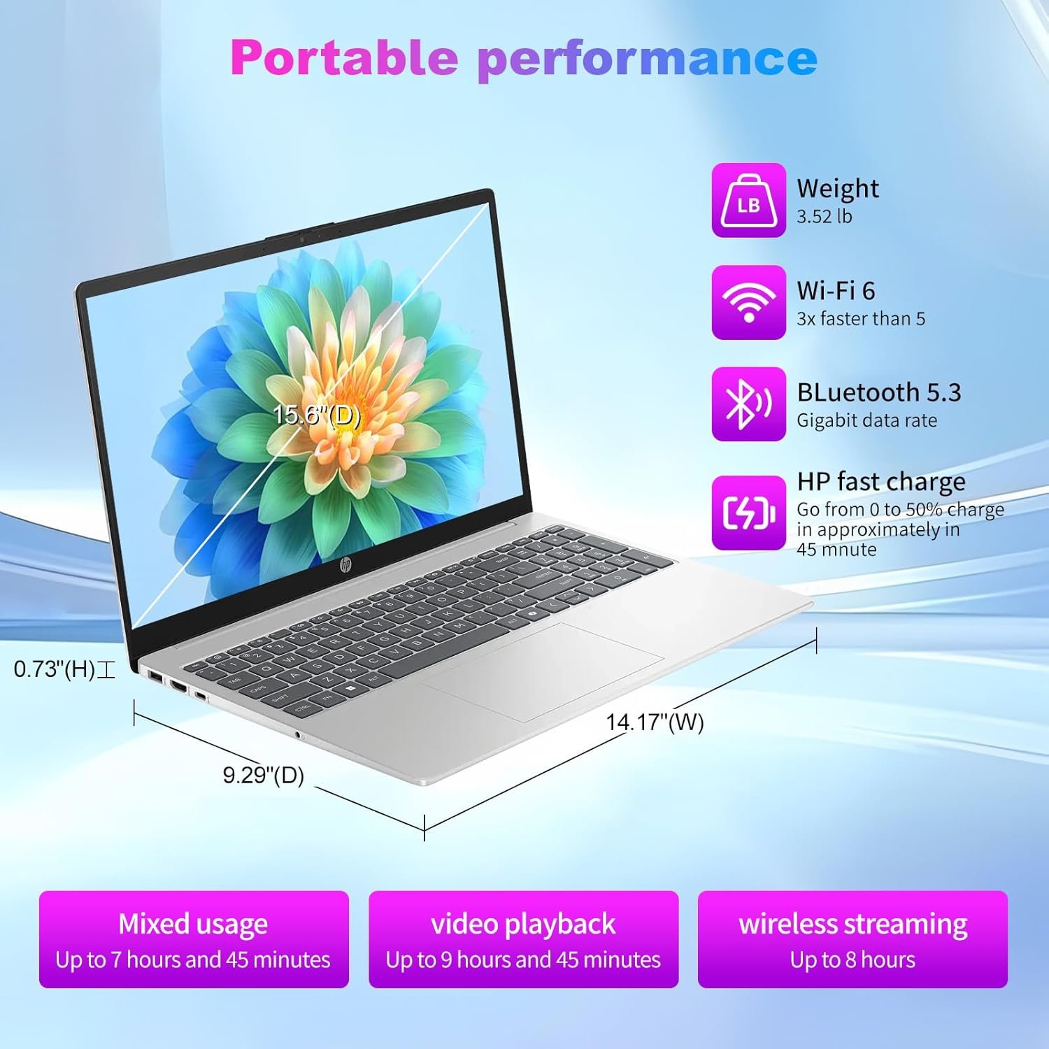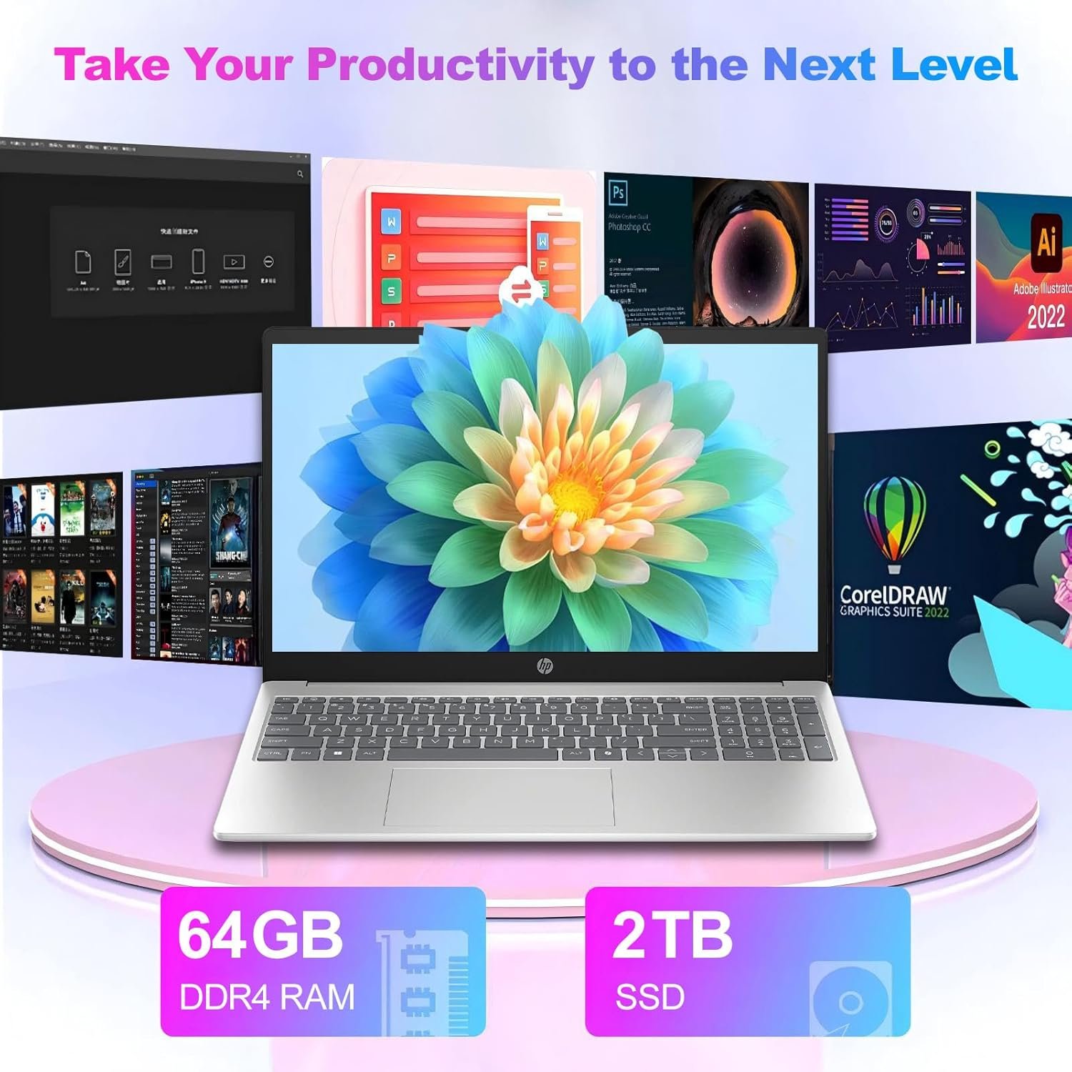 HP Portátil empresarial FHD de 15,6 pulgadas, Intel 10-Core i7-1355U hasta 5 GHz, 64 GB de RAM, SSD de 2 TB, GPU Intel Iris Xe, Wi-Fi 6, cámara, HDMI, Copilot, batería de larga duración, Windows 11
