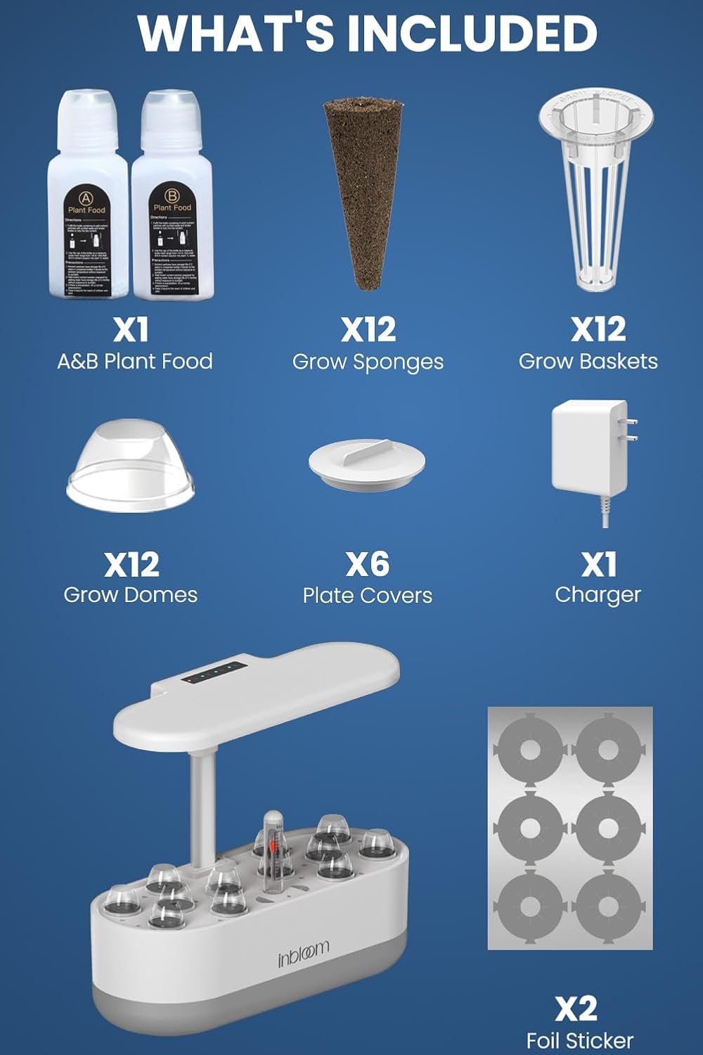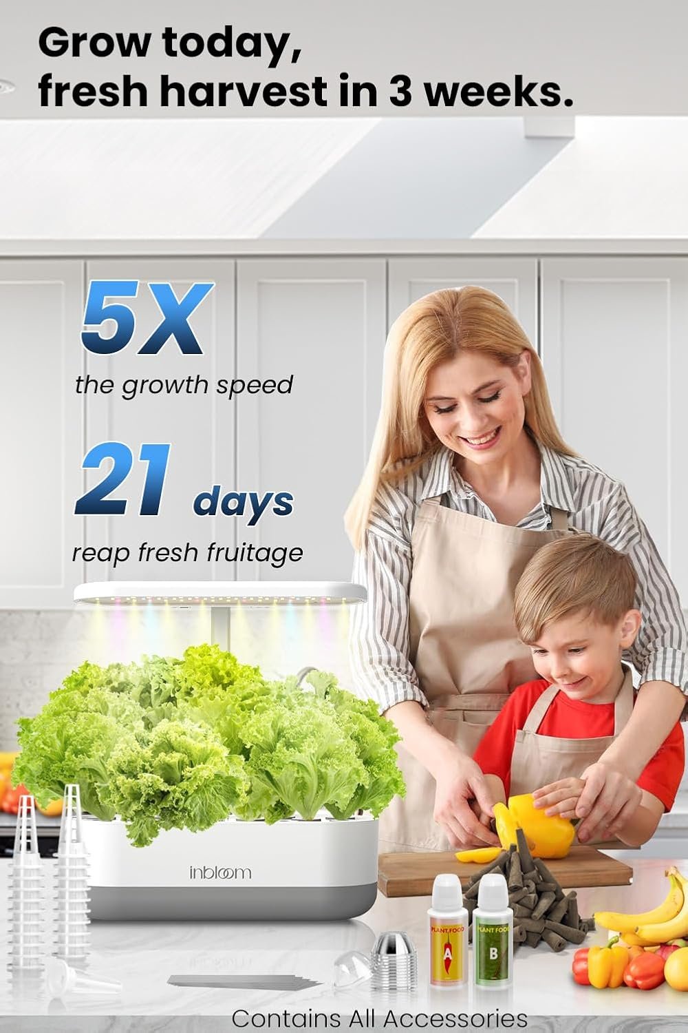inBloom Sistema de cultivo hidropónico de 12 cápsulas para jardín interior con luz LED y kit de vainas, kit de germinación de plantas con bomba de agua de 4.2 L acelerada, altura ajustable, regalos de