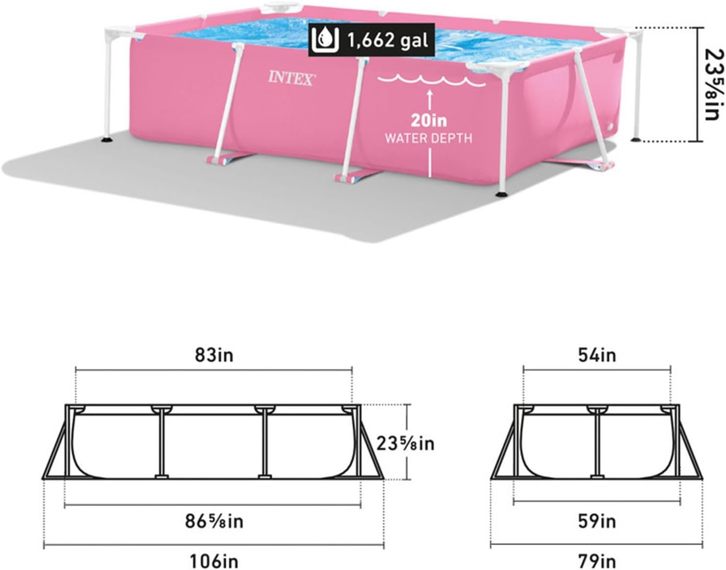 Intex 28266EH 7'L x 5' W x 23-5/8"e; H Marco de metal rectangular sobre el suelo piscina al aire libre, 439 galones de agua, rosa