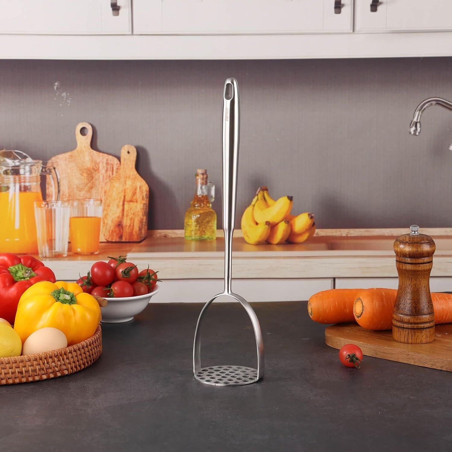 Juego de utensilios de cocina de acero inoxidable 18/10, 12 herramientas de cocina de metal y utensilios de servir de 15 pulgadas, triturador de papas, tenedor de carne, pinzas, volteador, pasta