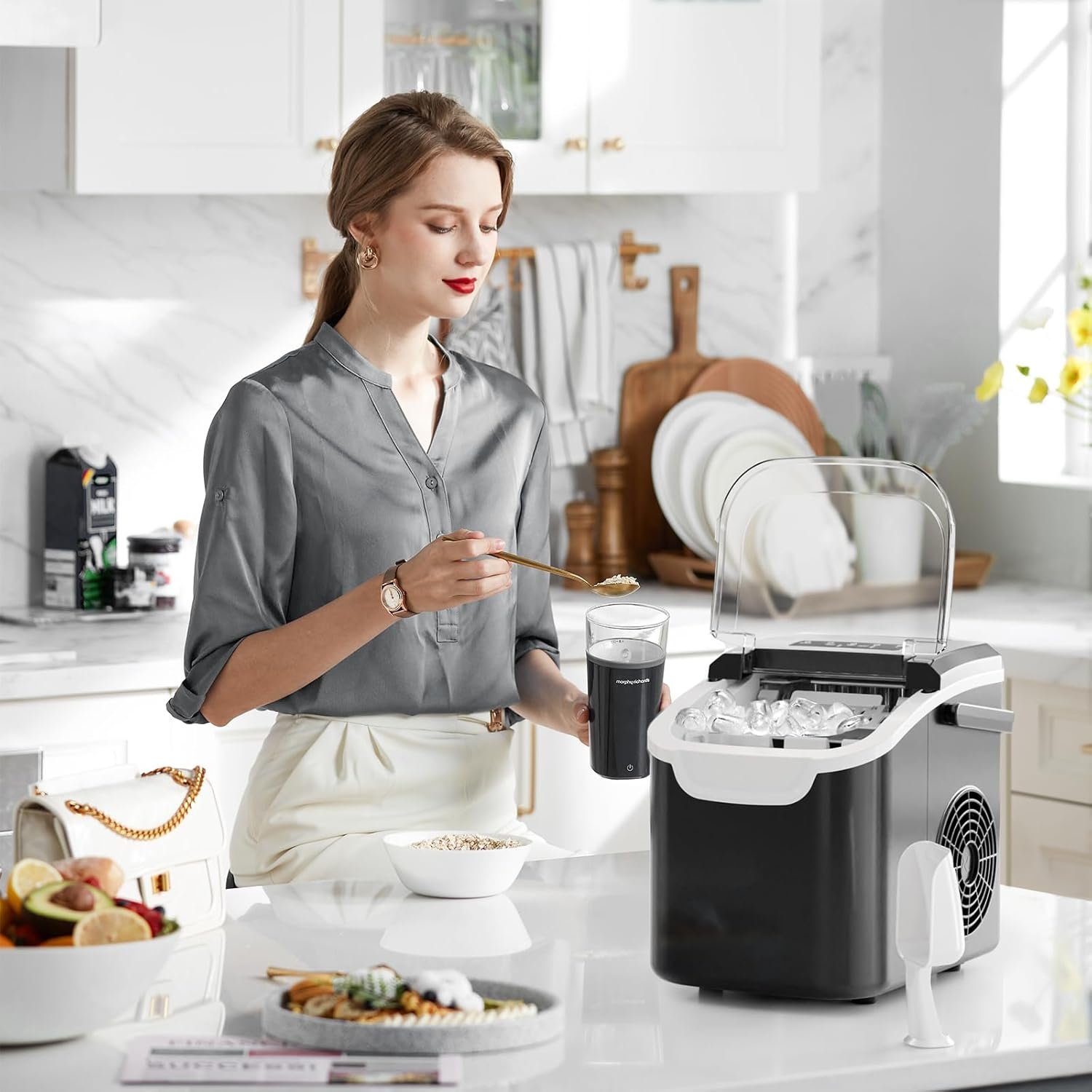 Kismile Encimera para hacer hielo con asa de transporte, 8 cubos en 6 minutos, 26 libras/día, 2 tamaños de hielo bala, máquina portátil para hacer hielo con autolimpieza para el hogar y la oficina