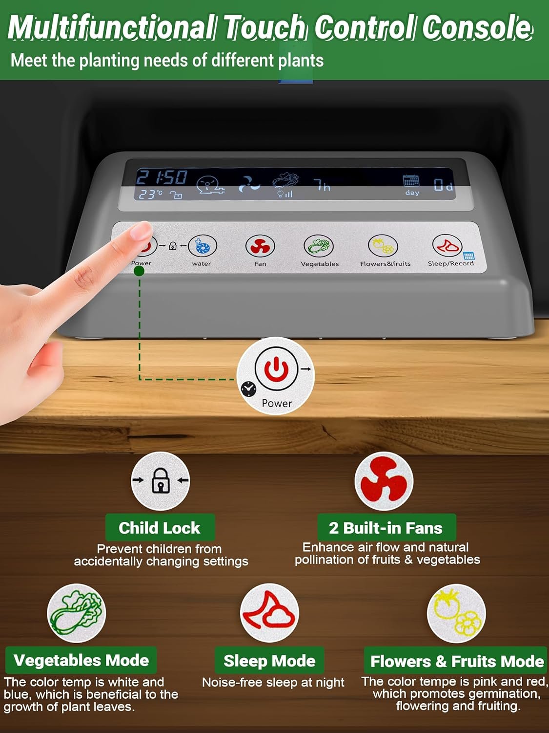 Diseño elegante y fácil de usar: el sistema de cultivo hidropónico Growell cuenta con una gran pantalla de 5.4 pulgadas que proporciona datos claros y completos sobre tu configuración hidropónica, lo que te da un control total sobre el crecimiento de tu planta. Con su configuración de botón sencilla, incluso los principiantes pueden operarlo con facilidad. Además, nuestro modo de bloqueo infantil evita que los niños curiosos interfieran accidentalmente con la configuración de tu sistema hidropónico.