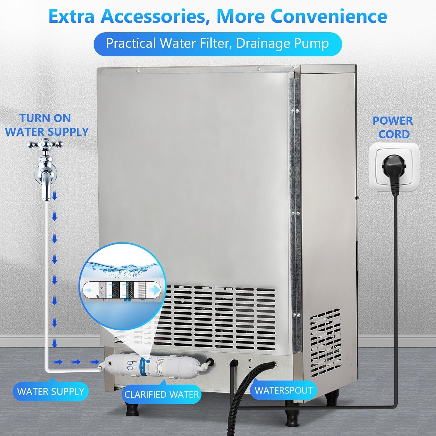 Máquina comercial para hacer hielo de 110 libras/24 horas con contenedor de almacenamiento de 27 libras, máquina de hielo de acero inoxidable con cuchara de hielo, bomba de drenaje de agua eléctrica y