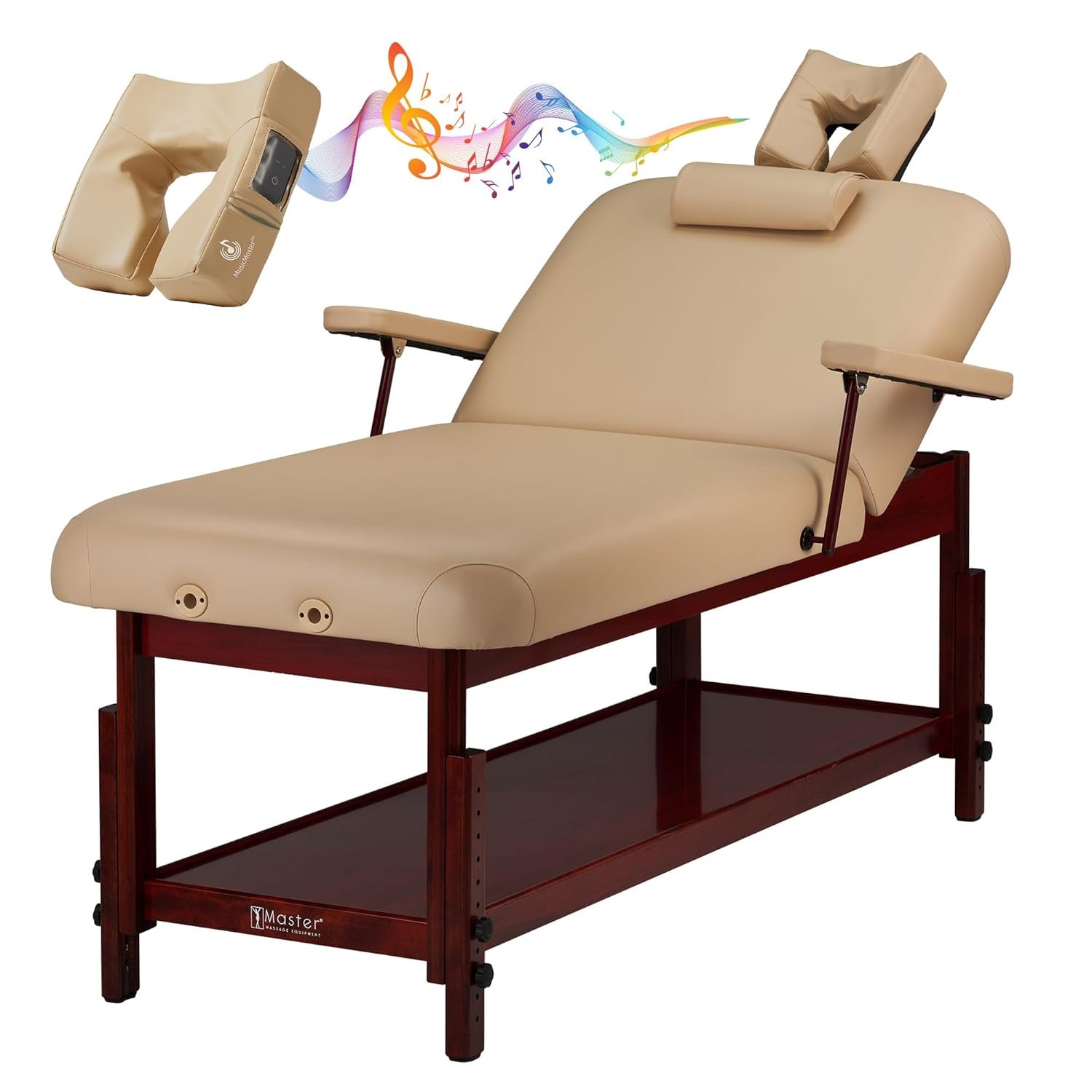 Master Massage SpaMaster – Mesa de masaje estacionaria de 31 pulgadas, paquete de cama de belleza con extra MusicMaster ergonómico Dream Sound Face Cradle – Crema