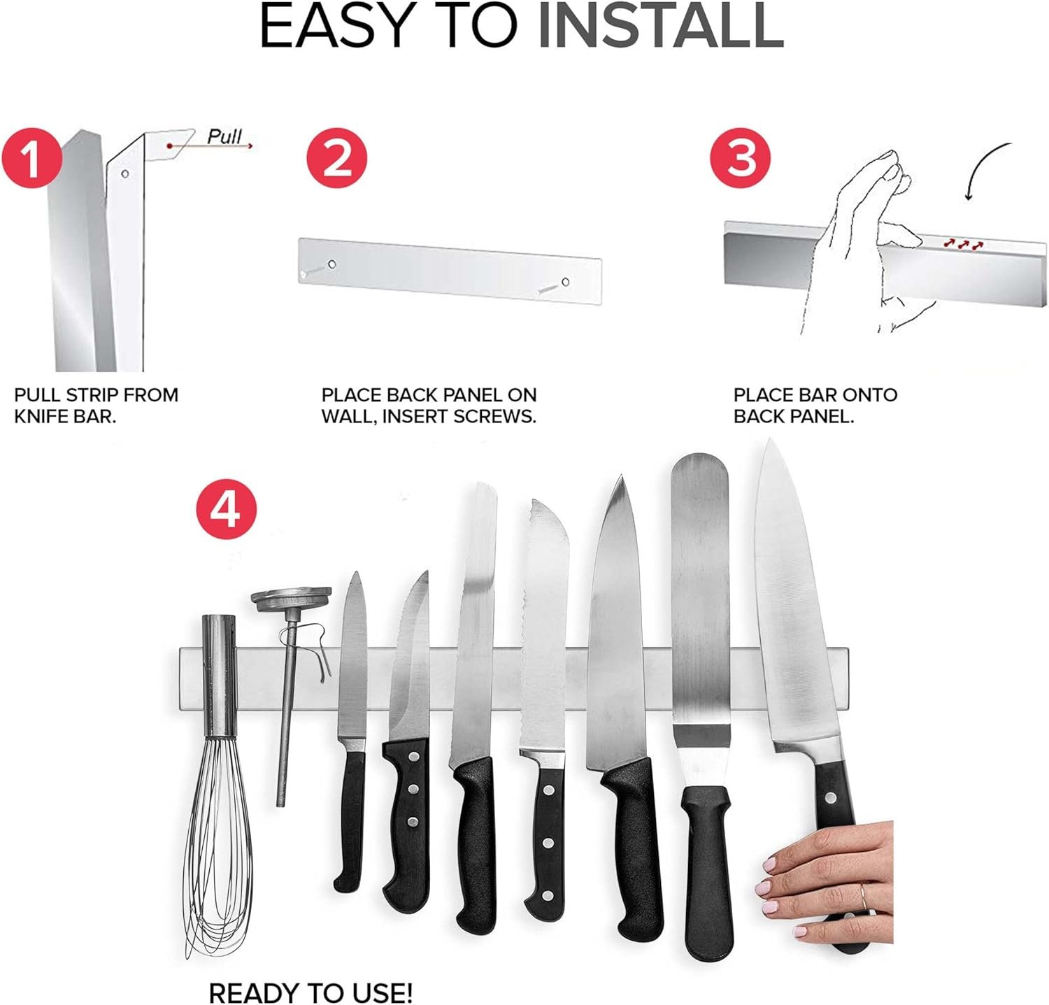 Barra magnética para cuchillos de 18 pulgadas: deshazte de tu voluminoso bloque de cuchillos: nuestra tira magnética para cuchillos hace que organizar tu cocina, cobertizo de herramientas, sala de estraza y más sea muy fácil. Cubierto en elegante acero inoxidable con acabado satinado, nuestra barra de cuchillos tiene un aspecto sofisticado que complementa sin esfuerzo cualquier decoración del hogar. Con una fuerte fuerza magnética y calidad en la que puedes confiar, nuestra barra de cuchillos se convertirá fácilmente en tu organizador favorito para el hogar. * Accesorios de montaje incluidos.
