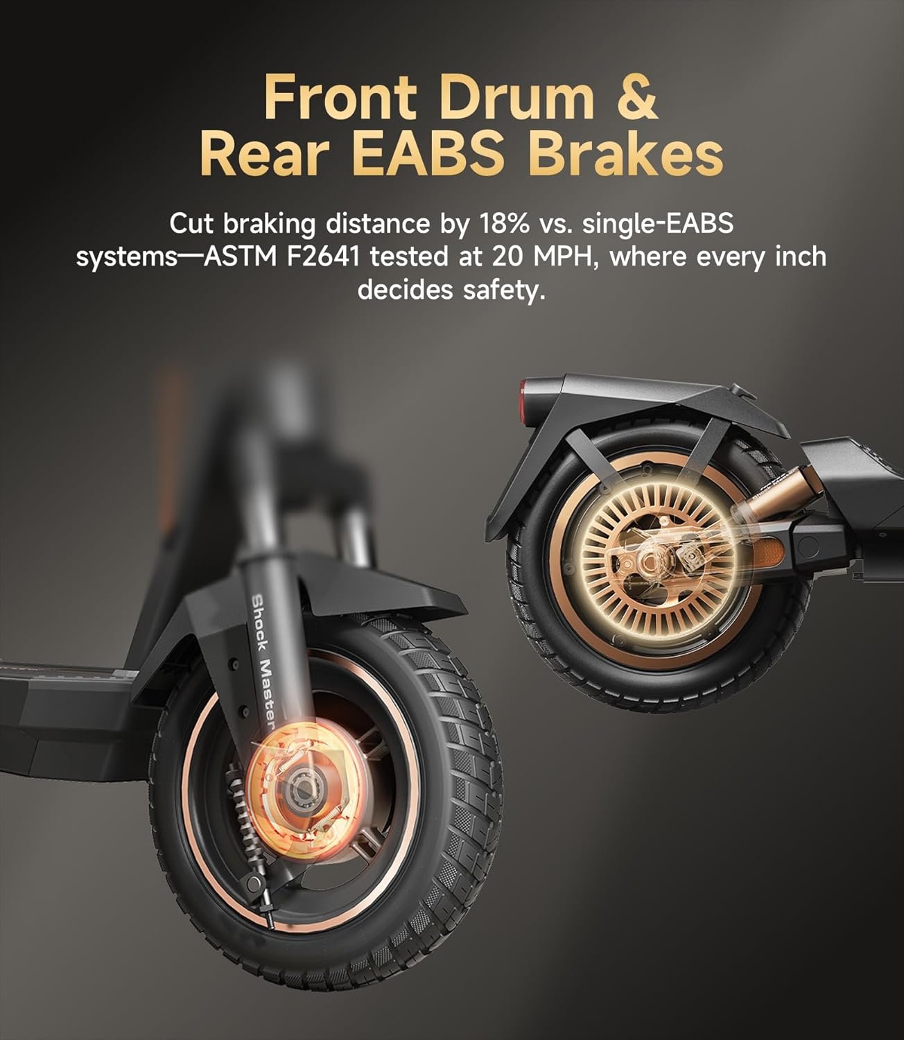 – Suspensión avanzada y sistema de frenado dual: diseñado para mayor estabilidad, el scooter eléctrico para adultos con suspensión cuenta con horquilla delantera + cilindro de amortiguación trasero para absorber golpes en terrenos irregulares. Junto con un sistema de frenado dual tambor delantero + EABS trasero, este potente scooter eléctrico garantiza un control preciso y potencia de frenado instantáneo a altas velocidades.