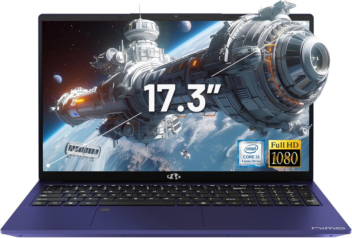 NIMO Portátil IPS FHD de 17.3 pulgadas, Intel 6 núcleos i3-1215U 16 GB de RAM 256 GB SSD Beat Ryzen 5 7520U, hasta 4.4 GHz computadora con teclado retroiluminado GaN tipo C de 65 W, para estudiantes