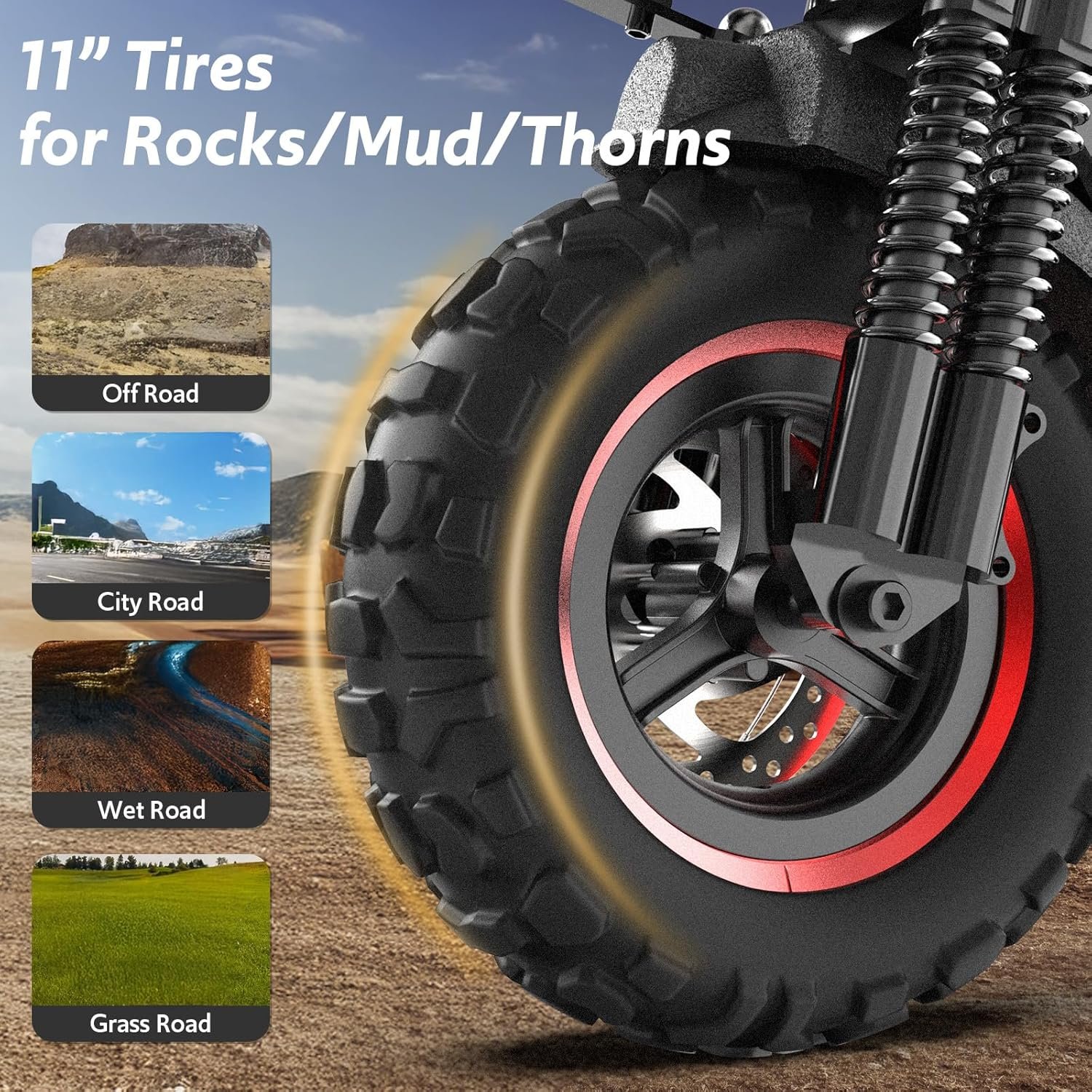 Confianza en todo terreno: neumáticos inflables resistentes a pinchazos de 11 pulgadas con patrones profundos de banda de rodadura conquistan baches urbanos y caminos de grava por igual. Nuestro sistema de doble suspensión delantera y trasera absorbe las vibraciones para paseos más suaves, ya sea navegando por calles suburbanas o senderos de tierra llena.
