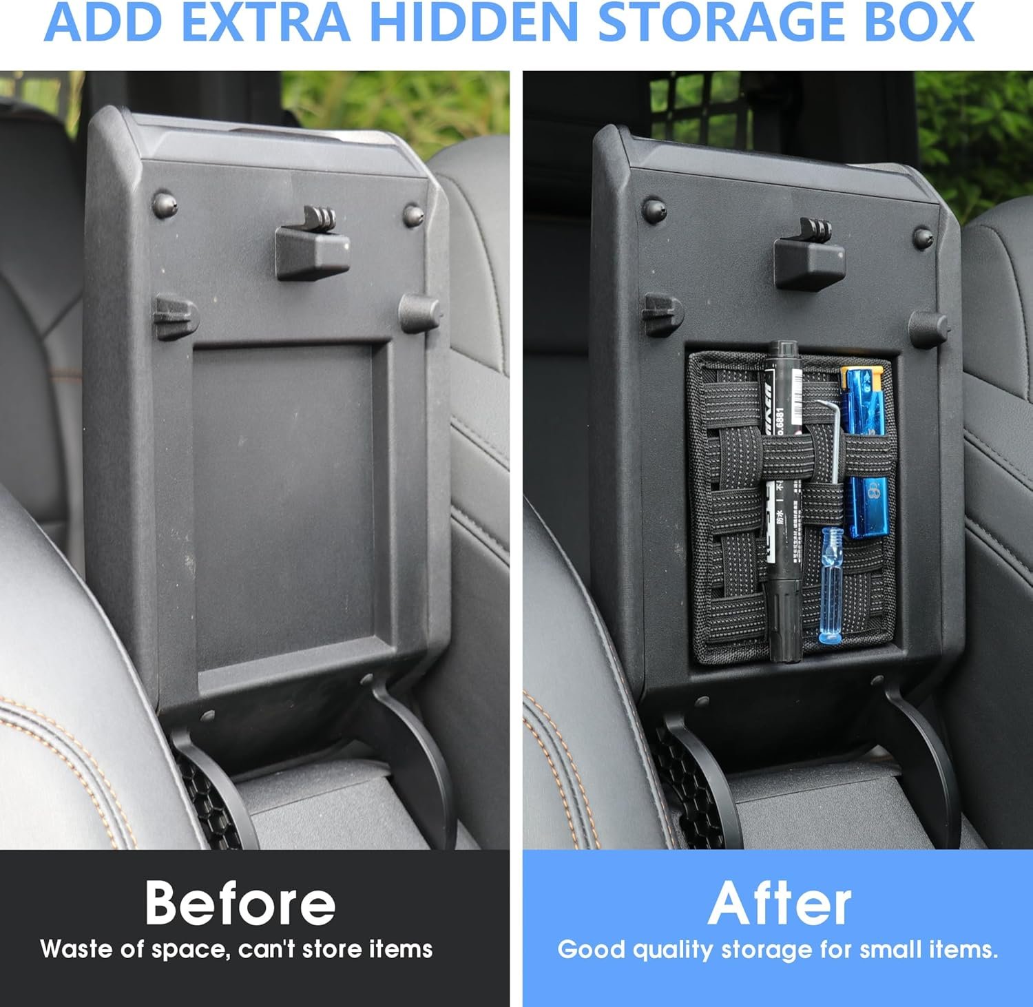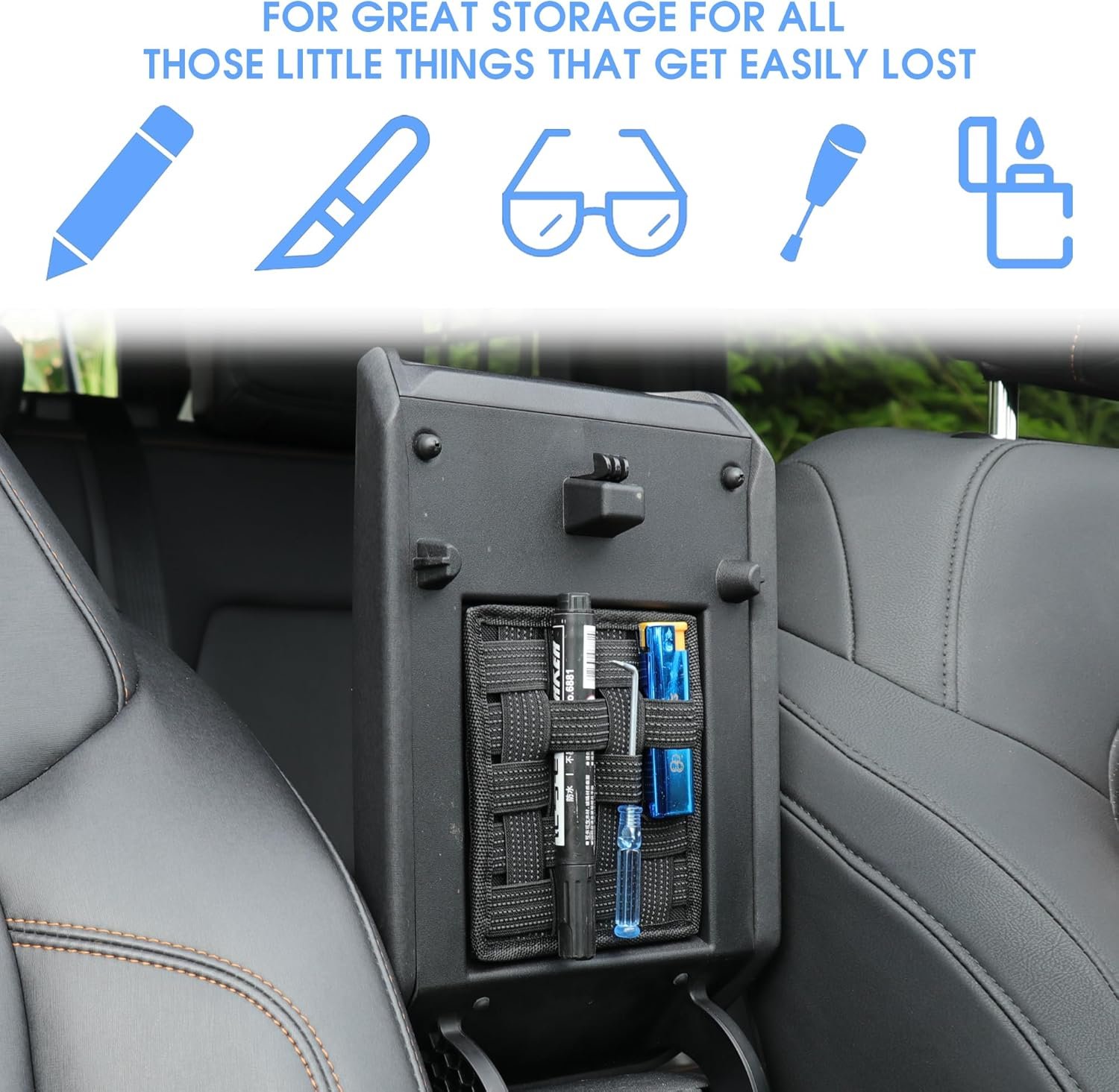 Fácil organización de consola central de automóvil: los organizadores de consola central mantienen tus artículos cerca y la decoración del coche organizada. Estilo de correa cosida para proporcionar más ranuras, se mantiene como organizador de bolígrafos, cuchillo de rescate, lentes y almacenamiento para mucho más