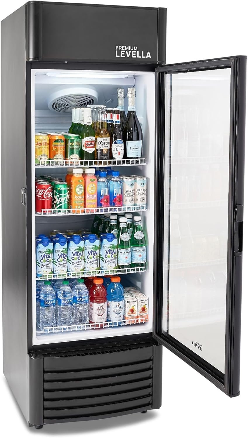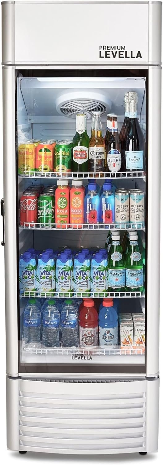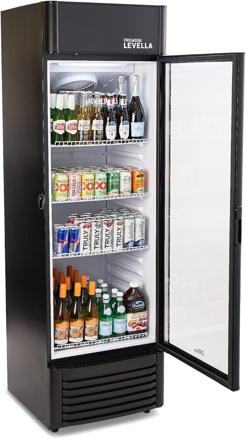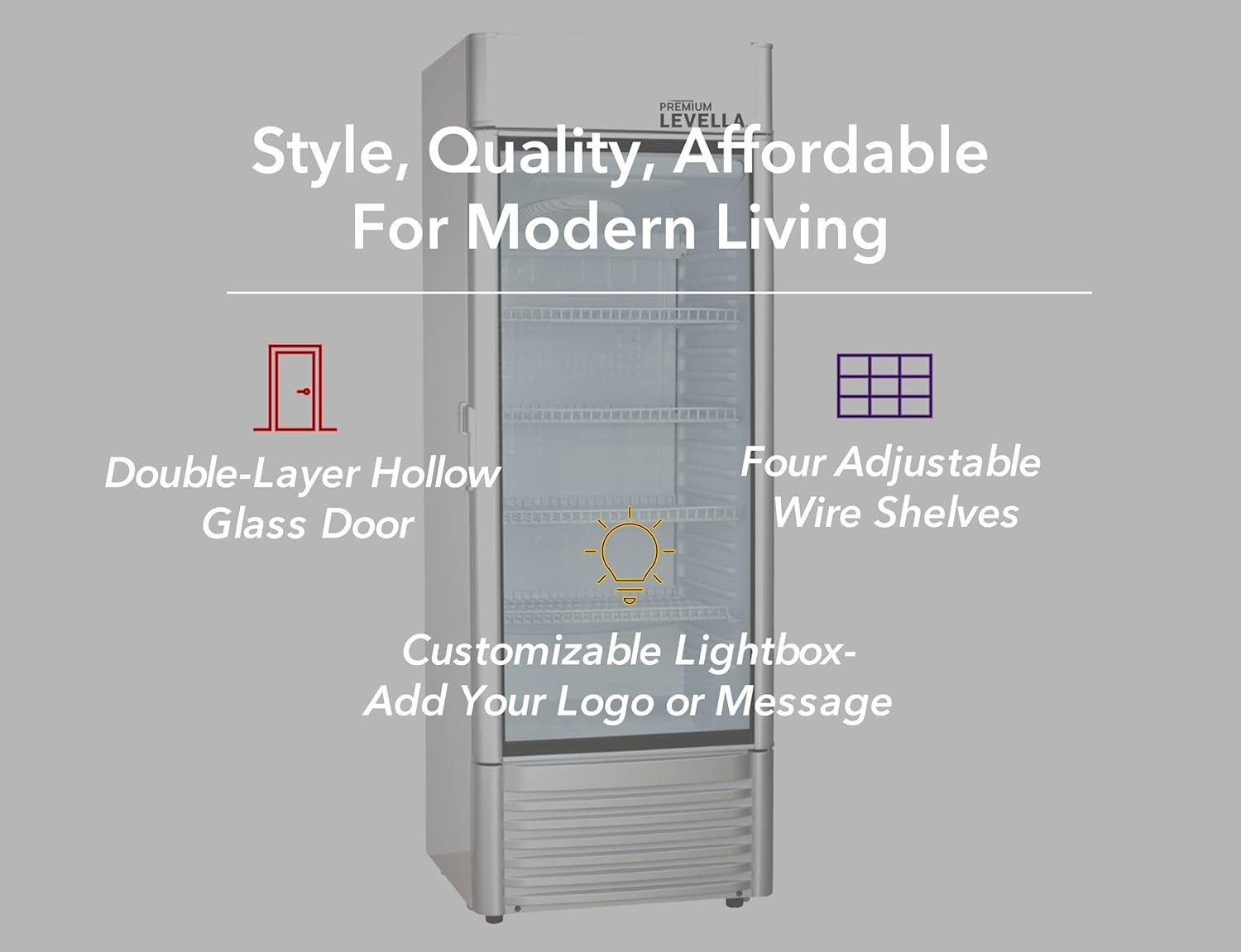PremiumLevella PRF90DX Refrigerador De Pantalla De Puerta De Vidrio 9.0 pies cúbicos Comercial Refrigerador De Bebidas Merchandiser Con Caja De Luz Personalizable – Plata