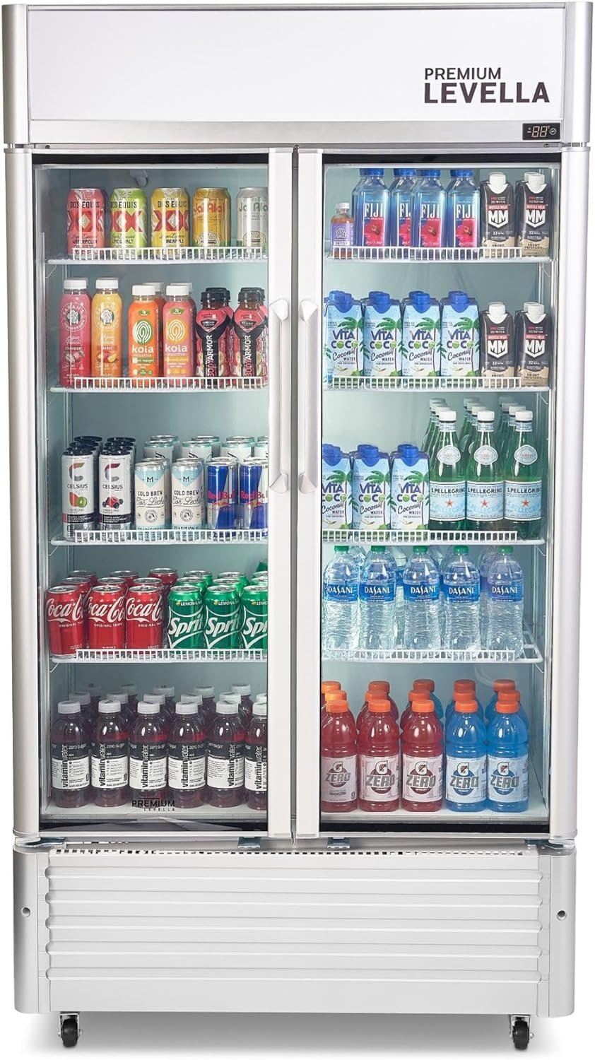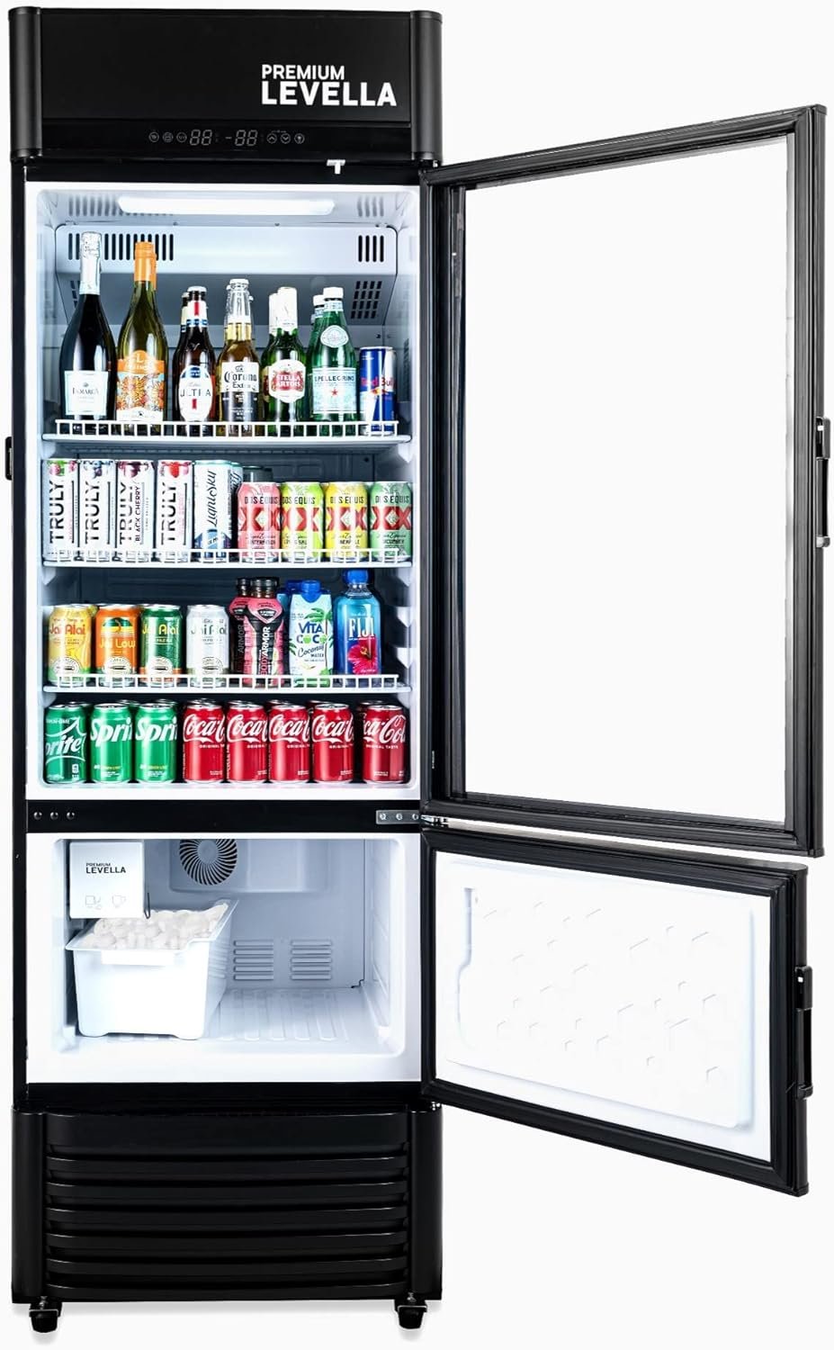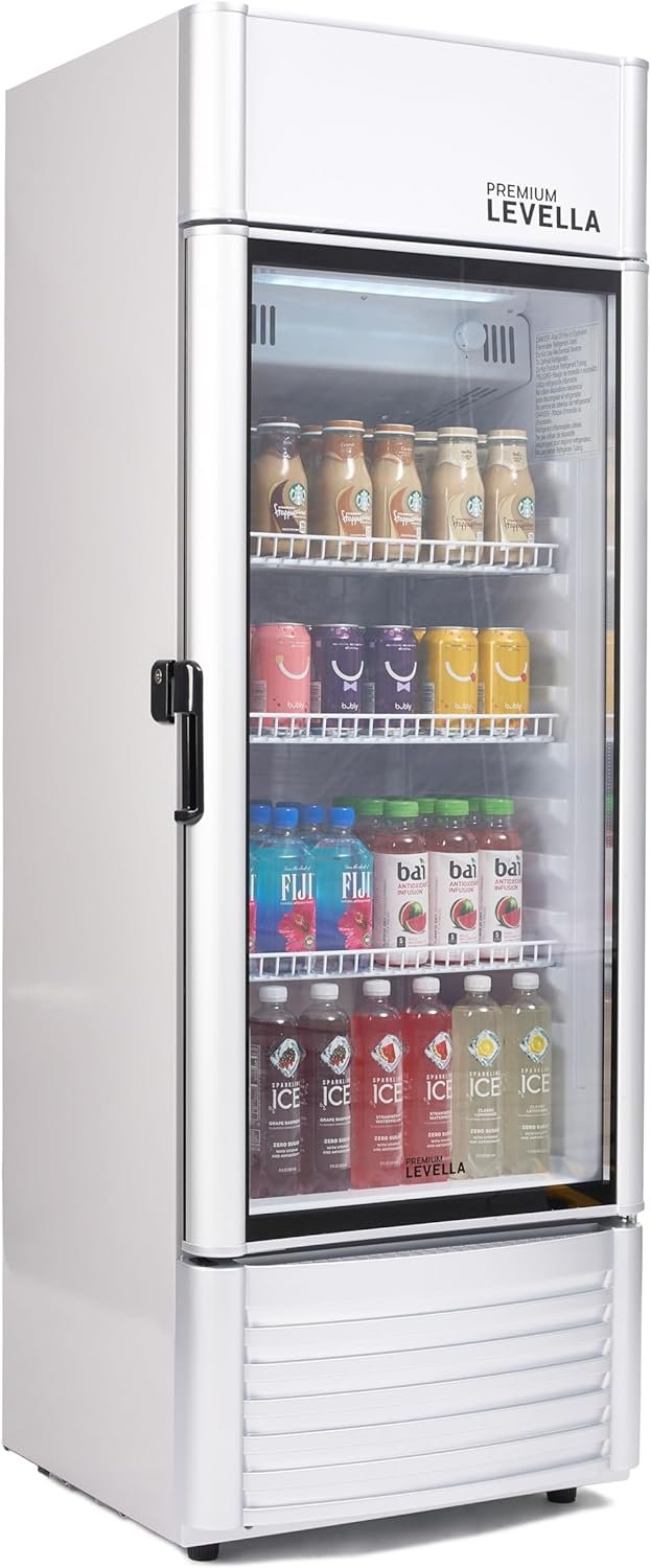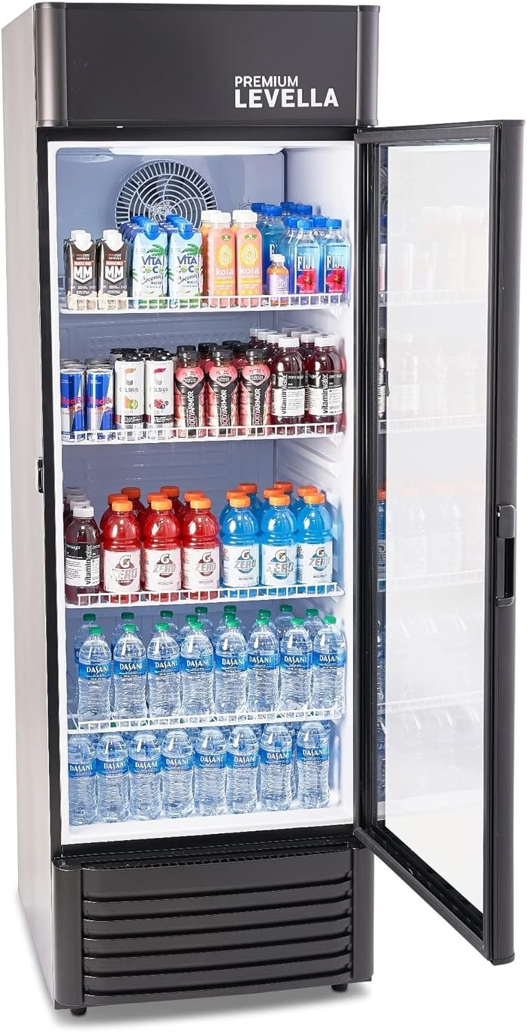 PremiumLevella PRF90DX Refrigerador De Pantalla De Puerta De Vidrio 9.0 pies cúbicos Comercial Refrigerador De Bebidas Merchandiser Con Caja De Luz Personalizable – Plata