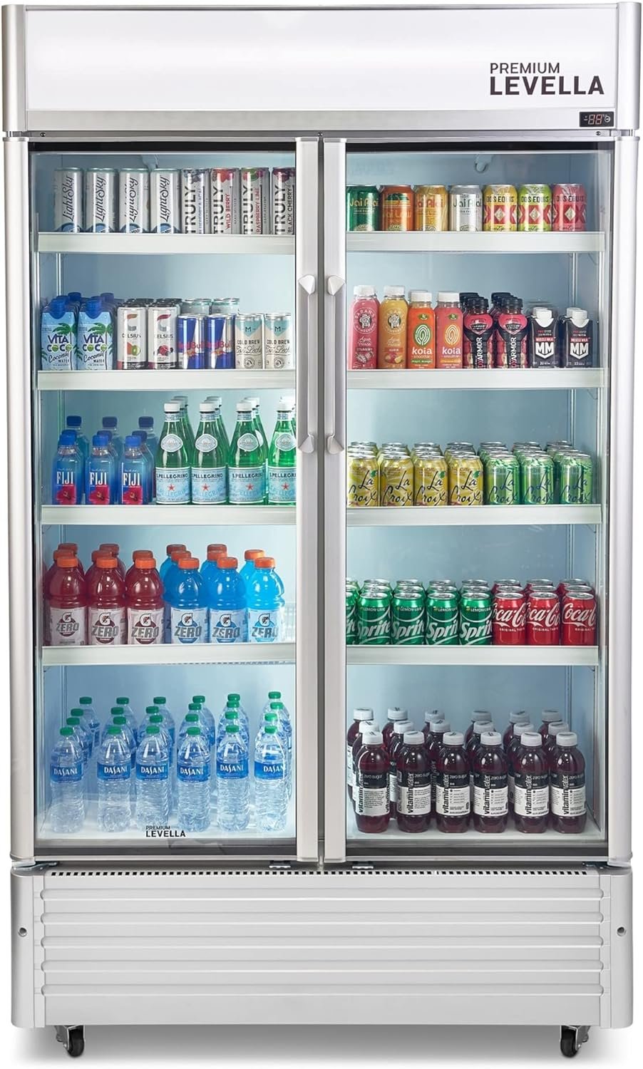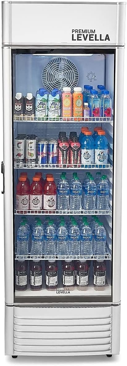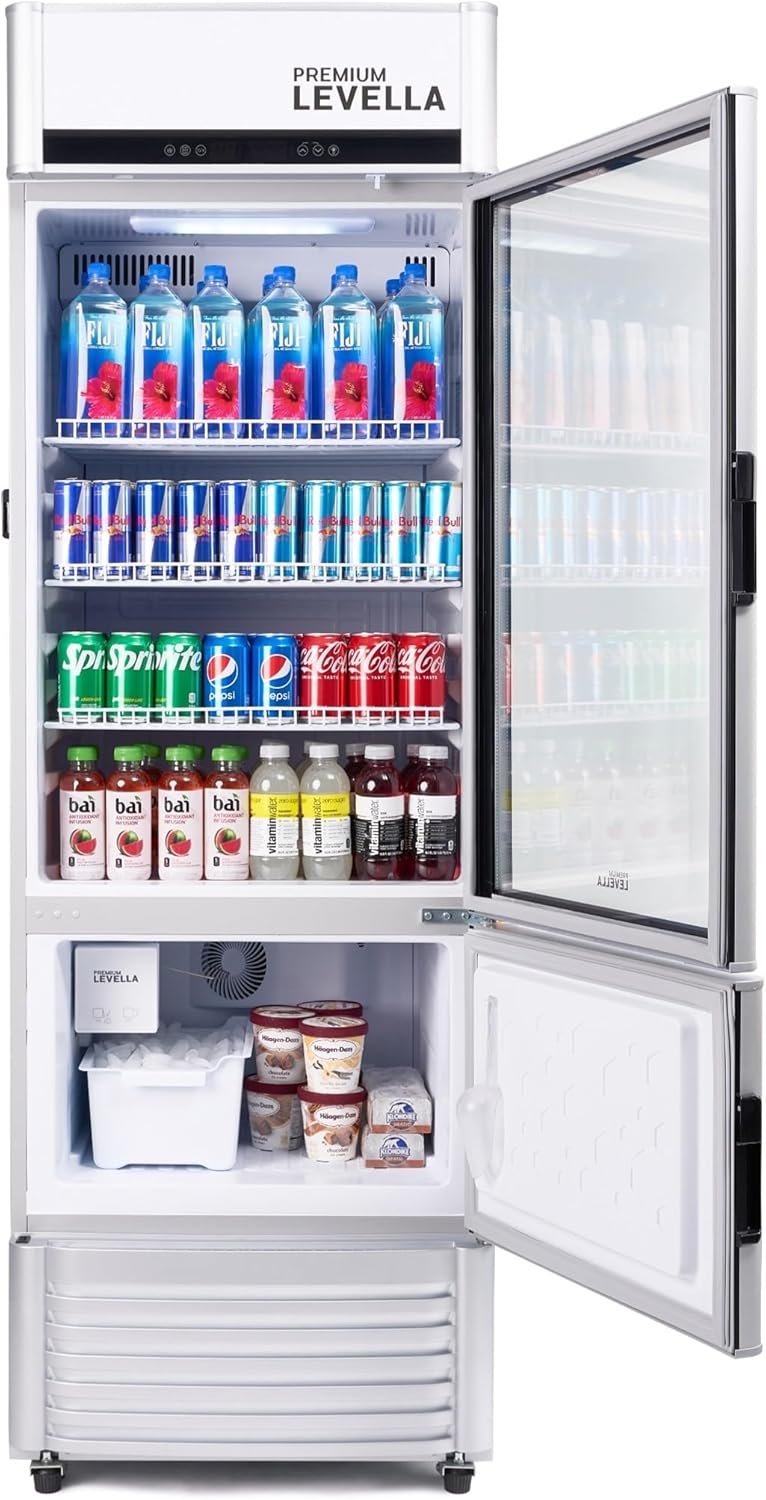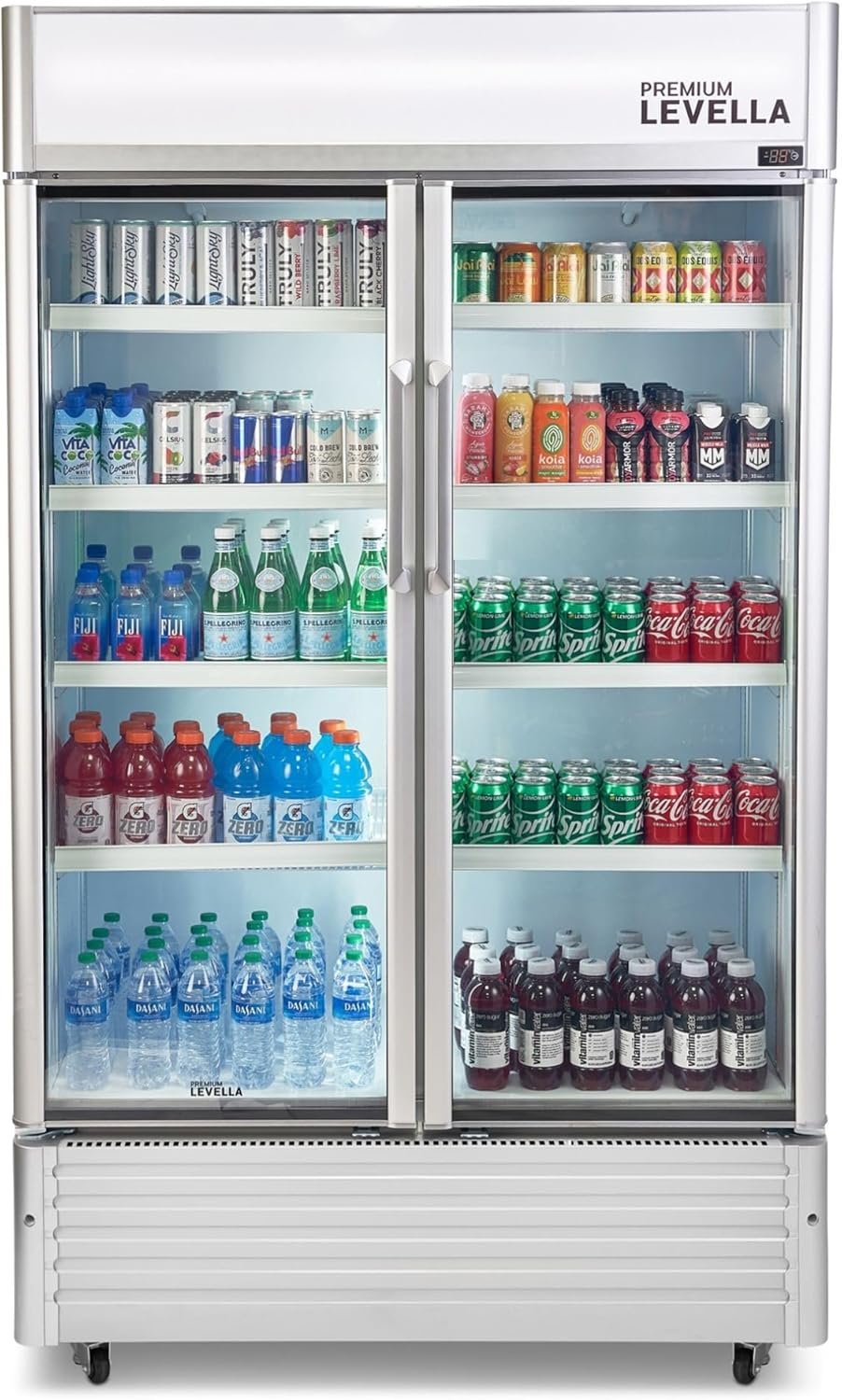 PremiumLevella PRF90DX Refrigerador De Pantalla De Puerta De Vidrio 9.0 pies cúbicos Comercial Refrigerador De Bebidas Merchandiser Con Caja De Luz Personalizable – Plata