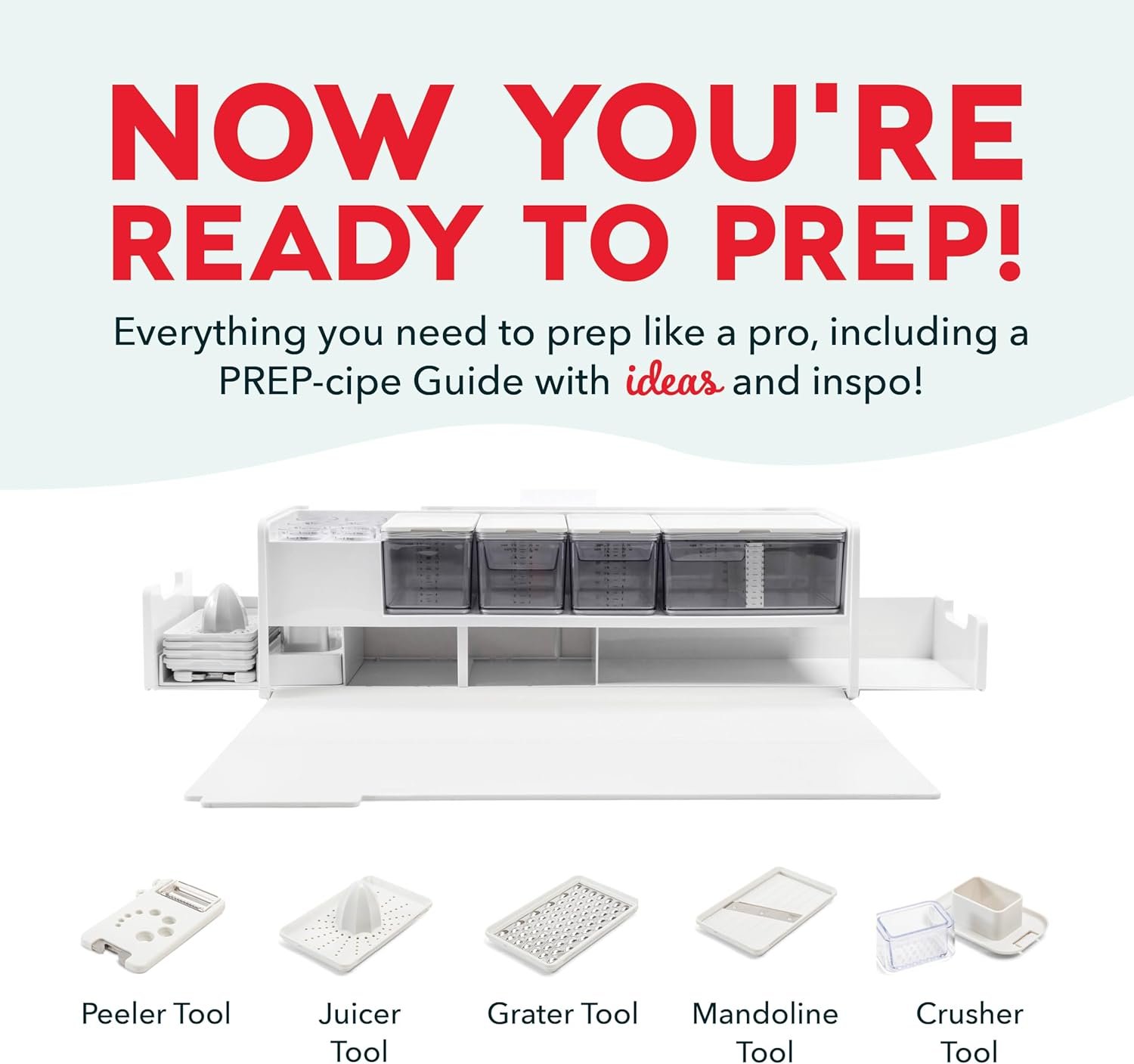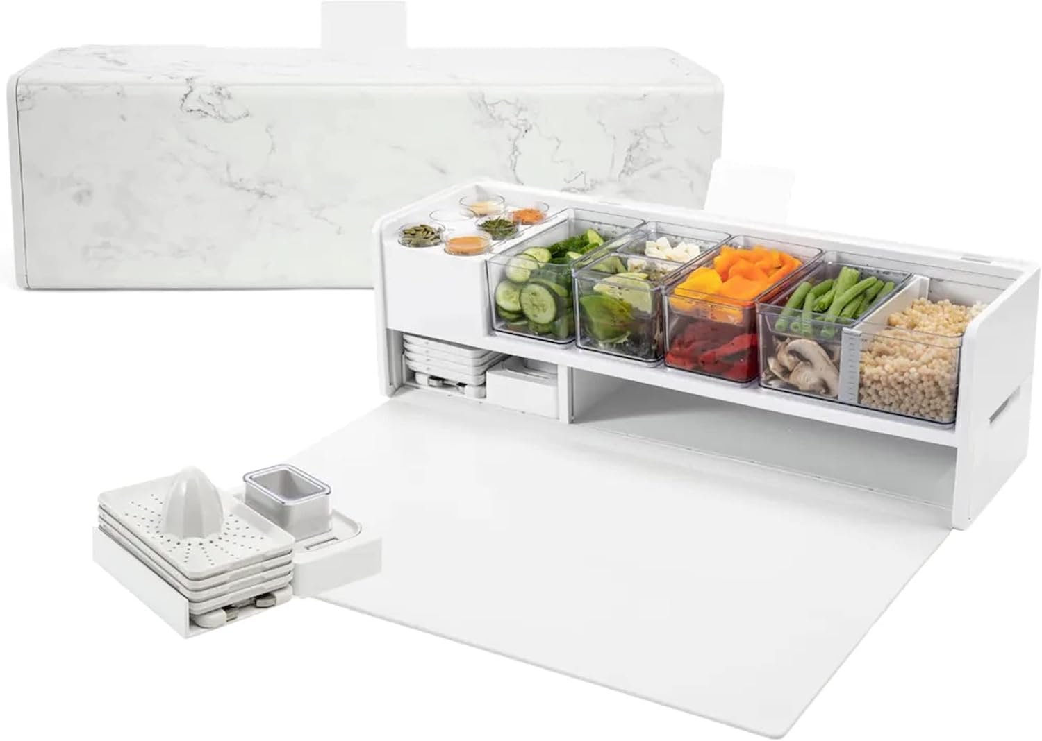 Prepdeck Estación de almacenamiento y preparación de recetas Gen 2 – 8 herramientas esenciales + tabla de cortar de lujo, 14 recipientes de plástico + tapas superselladas, compartimentos de basura