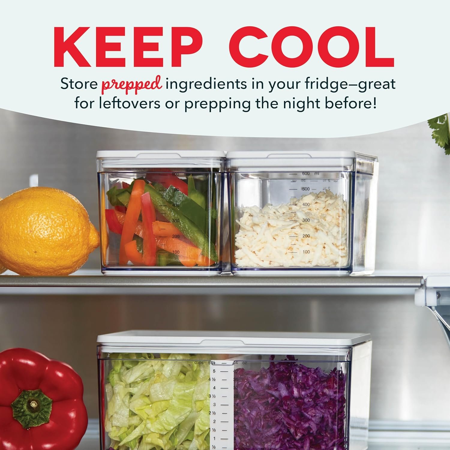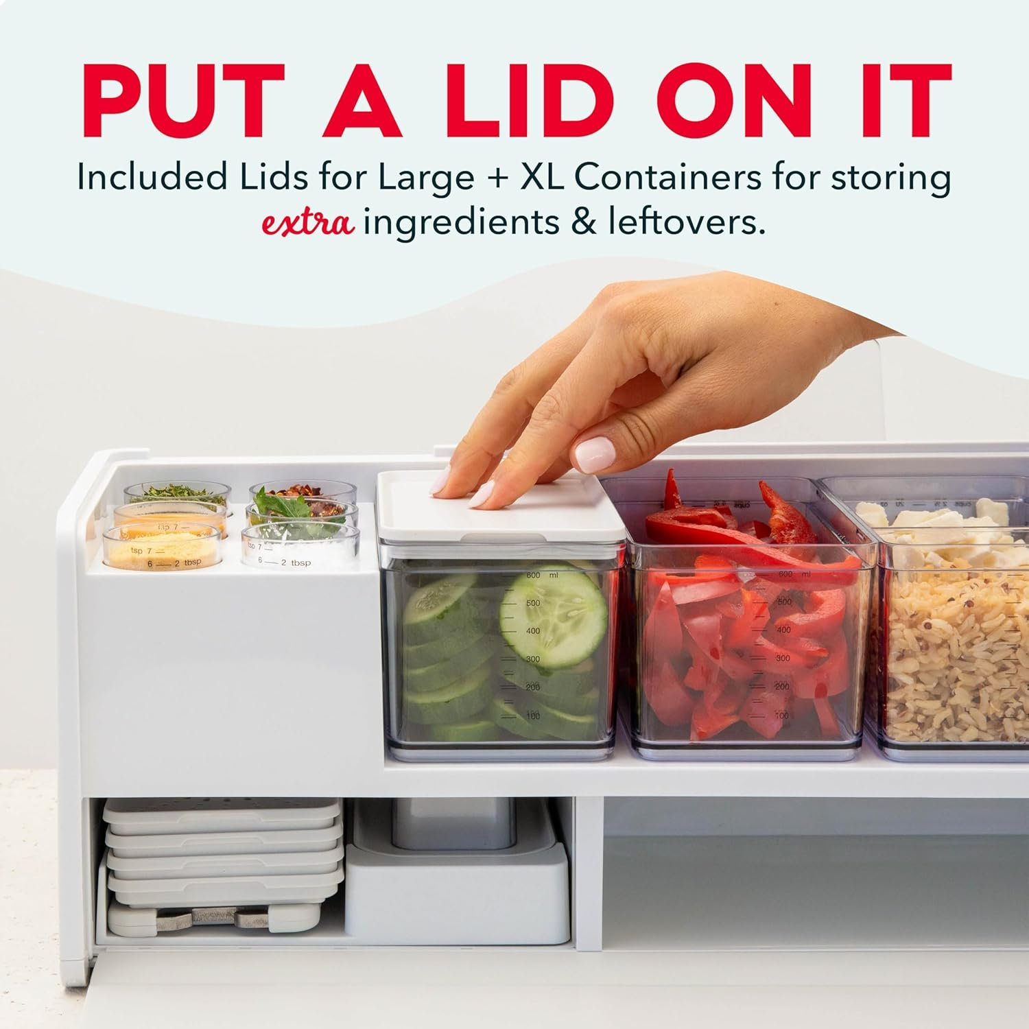 Más capacidad y almacenamiento antideslizante: este kit de lujo contiene todas las herramientas esenciales para optimizar el corte, rallar, pelar y más: tabla de cortar sin costuras rediseñada con imanes más fuertes, 8 herramientas de preparación, más 2 pequeños, 2 medianos, 3 grandes y 1 XL duraderos, recipientes seguros para alimentos con un 20% más de capacidad e indicadores de medición más grandes y claros en onzas, mililitros y tazas. Además de mini contenedores de fondo plano, sin punta, tapas de supersellado, cubo de basura extraíble y una unidad de almacenamiento integrada.