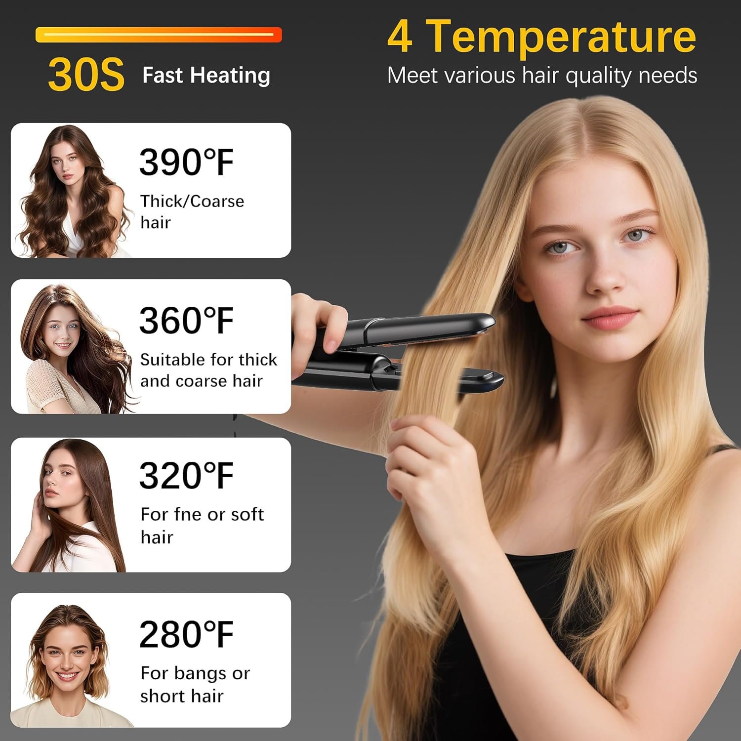 Control de precisión profesional de 4 temperaturas: peina sin esfuerzo todo tipo de cabello con ajustes de calor personalizables de cuatro etapas: 390 °F para cabello duro o grueso, 360 °F para cabello fino o suave, 320 °F para flequillo o cabello corto, y 280 °F para cabello sensible o dañado, proporcionando una protección suave como nueva característica.