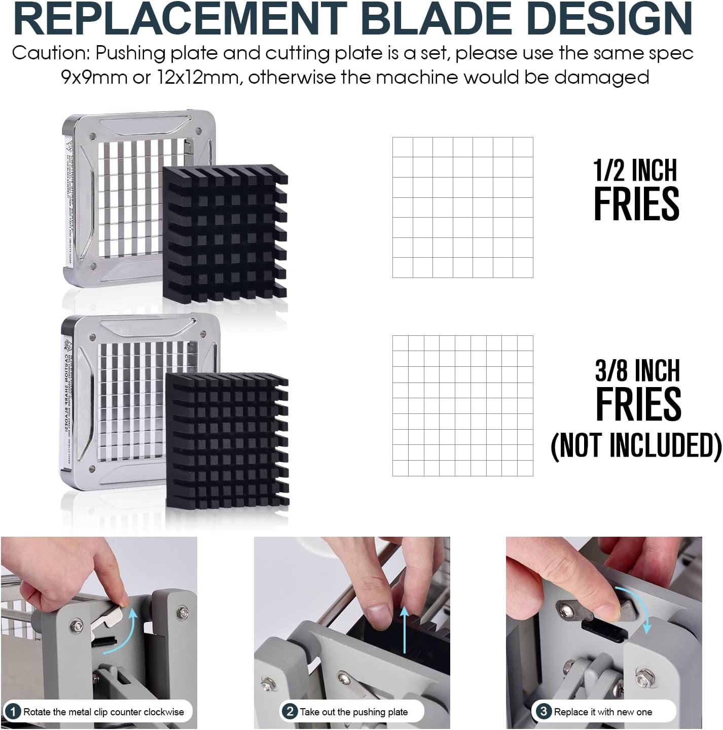 CONVENIENTE PARA TODOS: Corta papas fritas en trozos de 1/2″. También es ideal para calabacines, pepinos y otras verduras, frutas en palitos perfectamente formados en segundos. Crea impresionantes papas fritas, batatas fritas, etc. Para una hoja más delgada de 3/8 pulgadas, puedes consultar nuestra tienda y buscar hoja de 3/8 pulgadas