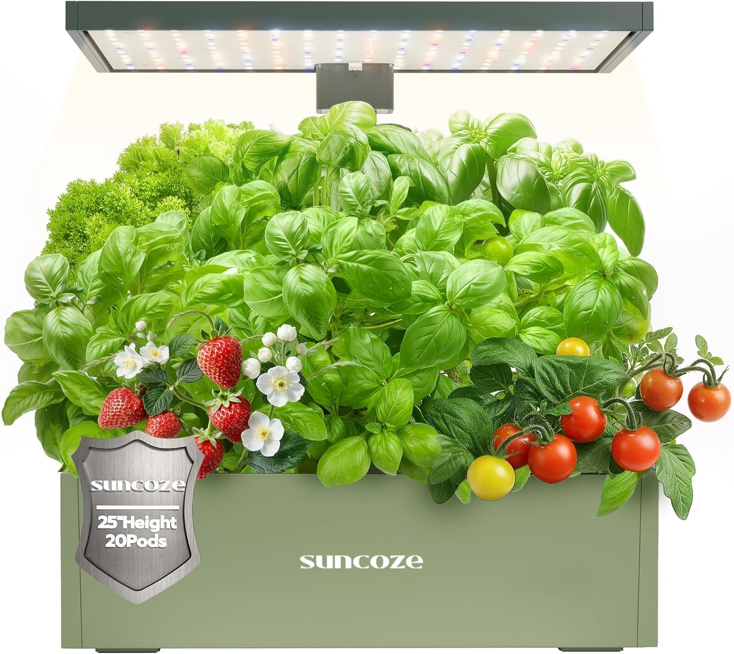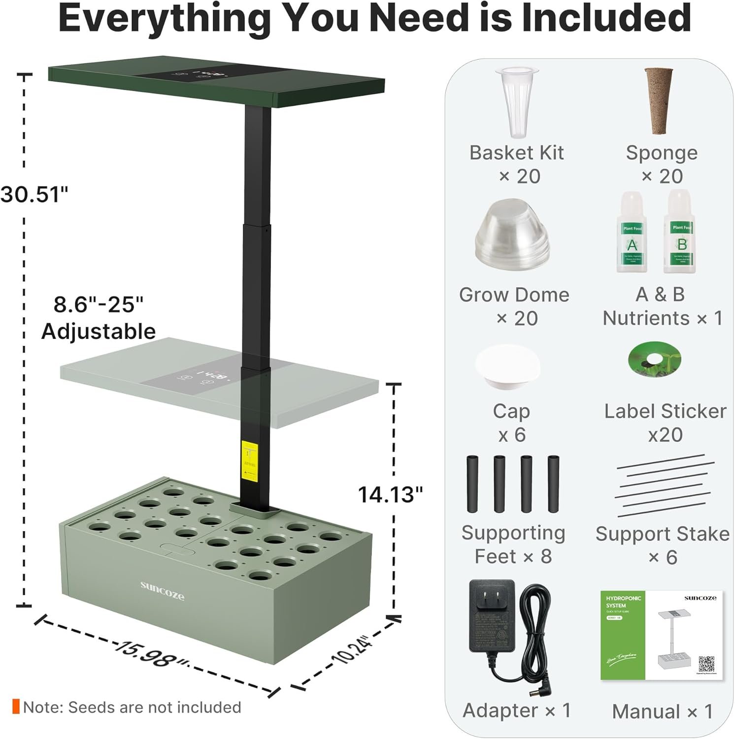 SUNCOZE Kit de sistema de cultivo hidropónico de 20 vainas, jardín de hierbas para interiores con luz de cultivo de 30 W, tanque de agua grande de 10 litros con altura ajustable de 25 pulgadas, bomba